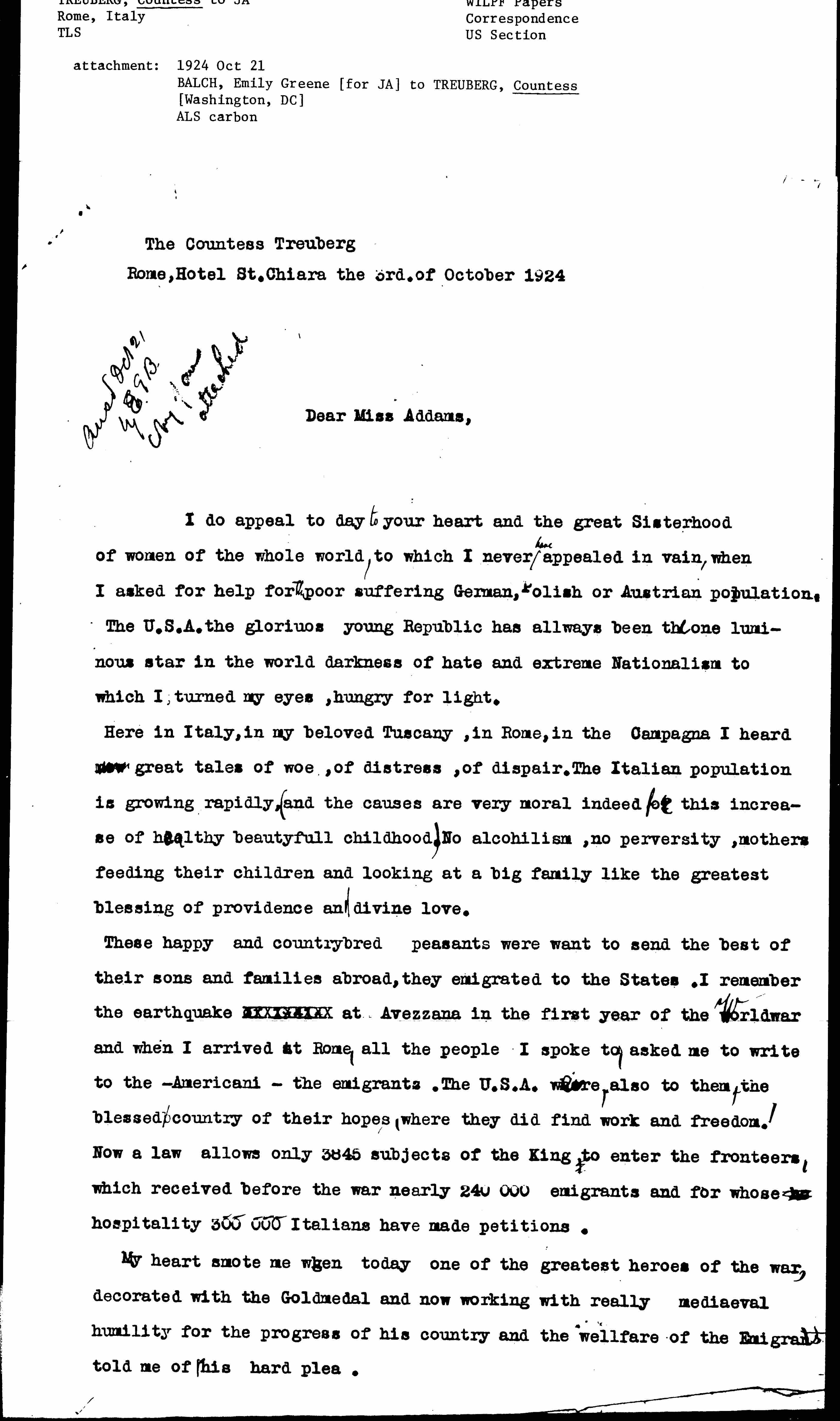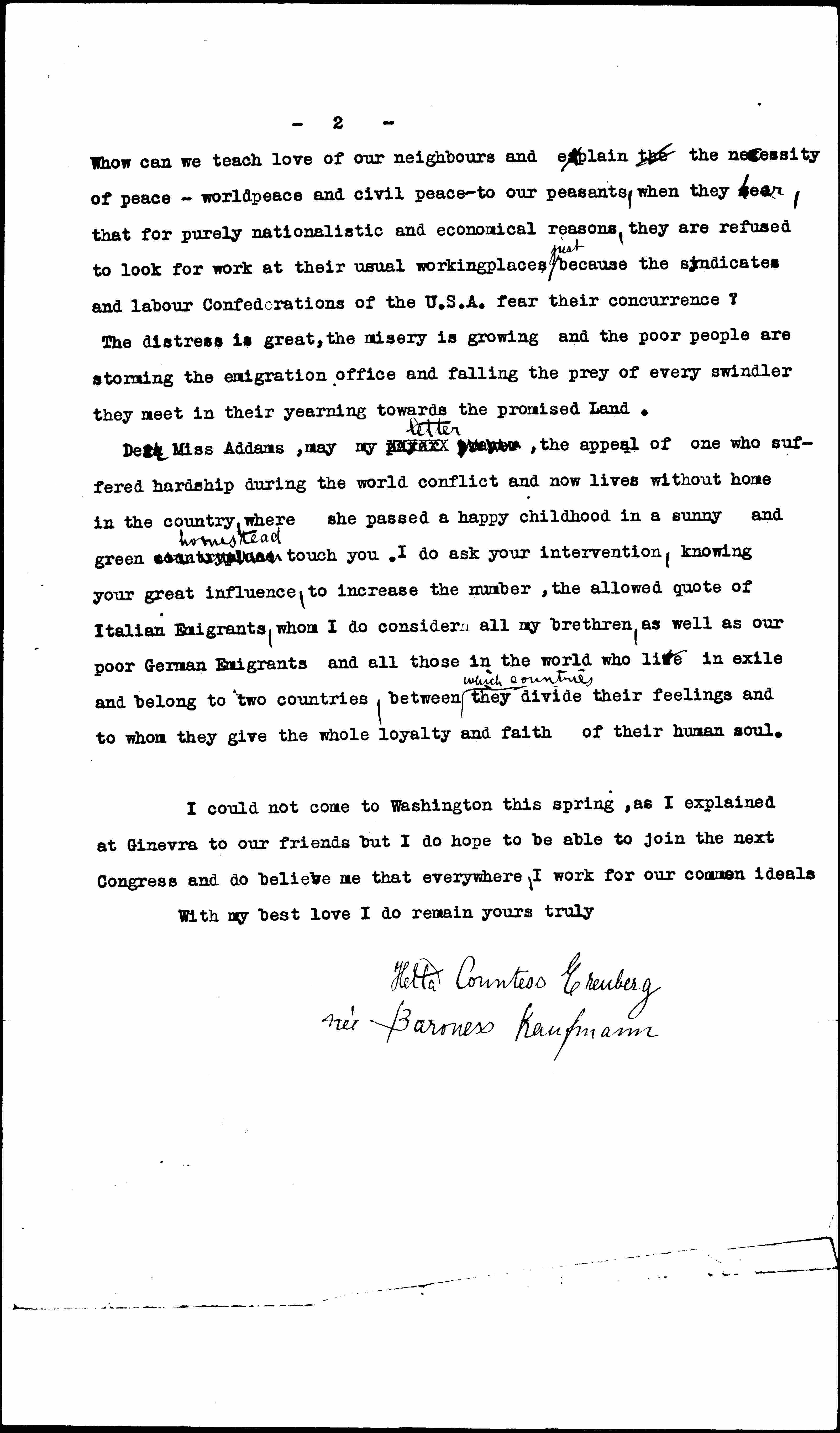 Dear Miss Addams, may my [illegible] ↑letter↓ [illegible], the appeal of one who suffered hardship during the world conflict and now lives without home in the country where she passed a happy childhood in a sunny and green [country place] ↑homestead↓ touch you. I do ask your intervention, knowing your great influence, to increase the number, the allowed [quota] of Italian Emigrants, whom I do consider all my brethren, as well as our poor German Emigrants and all those in the world who live in exile and belong to two countries, between ↑which countries↓ they divide their feelings and to whom they give the whole loyalty and faith of their human soul.