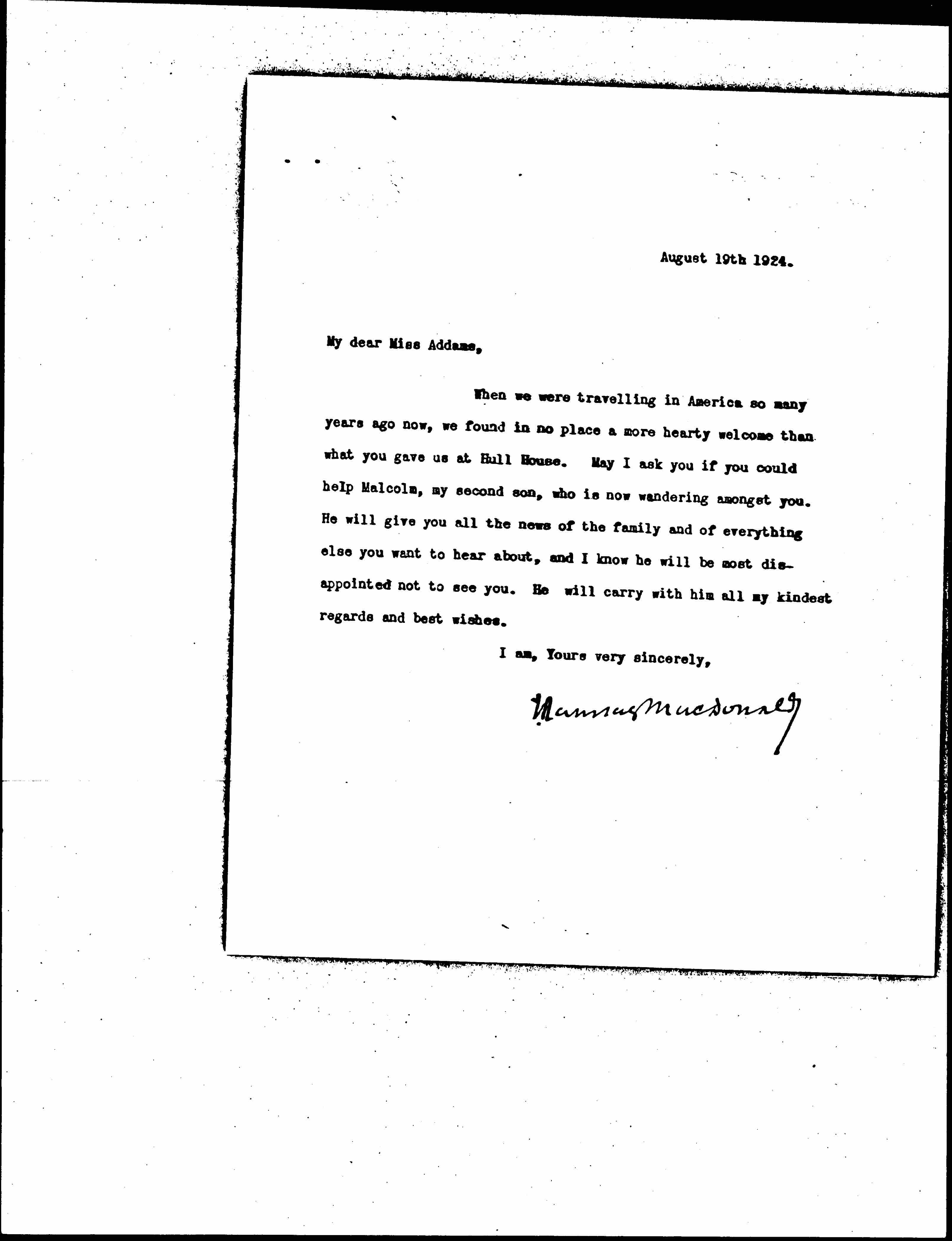 When we were [traveling] in America so many years ago now, we found in no place a more hearty welcome than what you gave us at Hull House. May I ask you if you could help Malcolm, my second son, who is now wandering amongst you. He will give you all the news of the family and of everything else you want to hear about, and I know he will be most disappointed not to see you. He will carry with him all my kindest regards and best wishes.