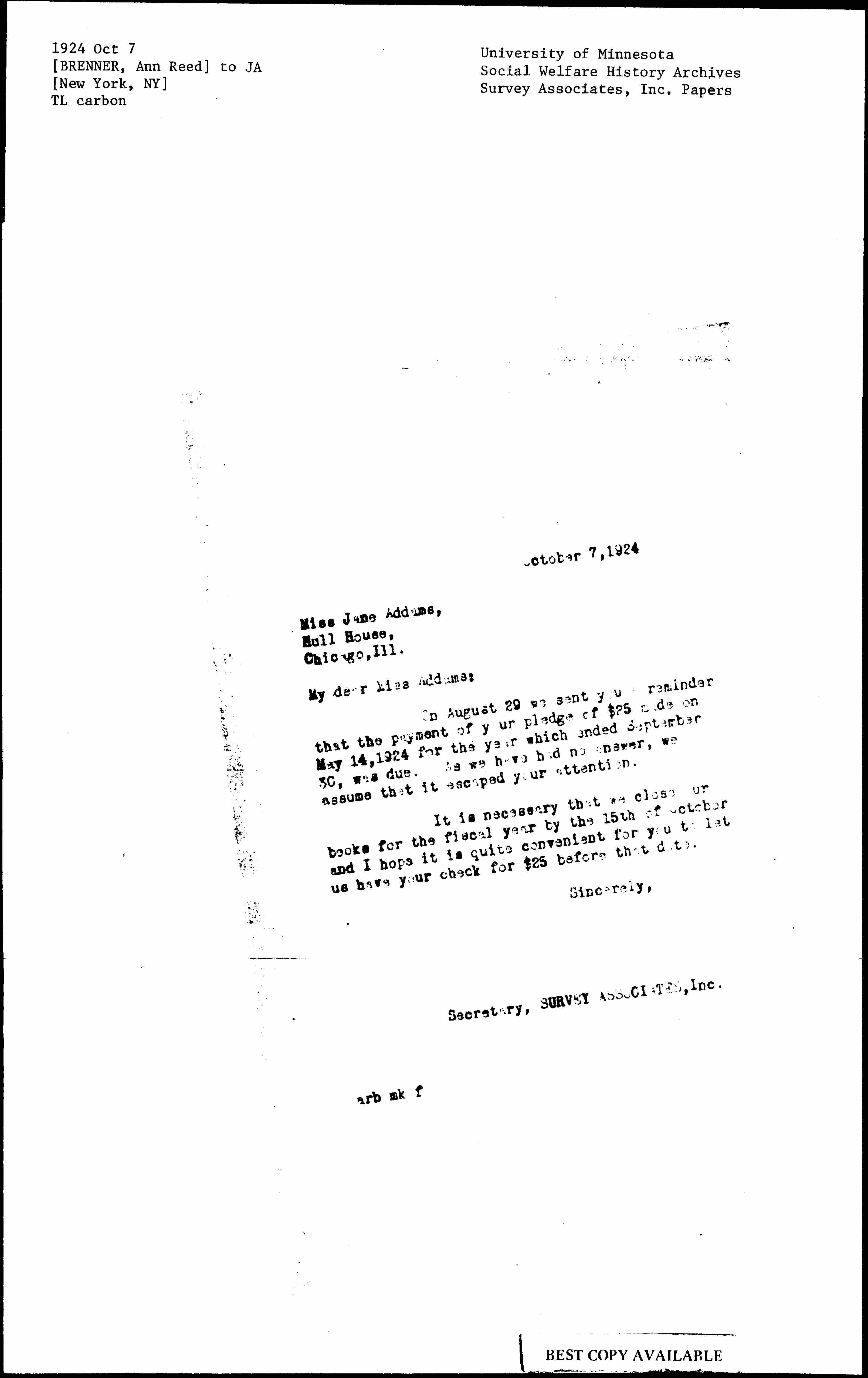 On August 29 we sent you [a] reminder that the payment for your pledge of $25 made on May 14, 1924 for the year which ended September 30, was due. As we have had no answer, we assume that it escaped your attention.