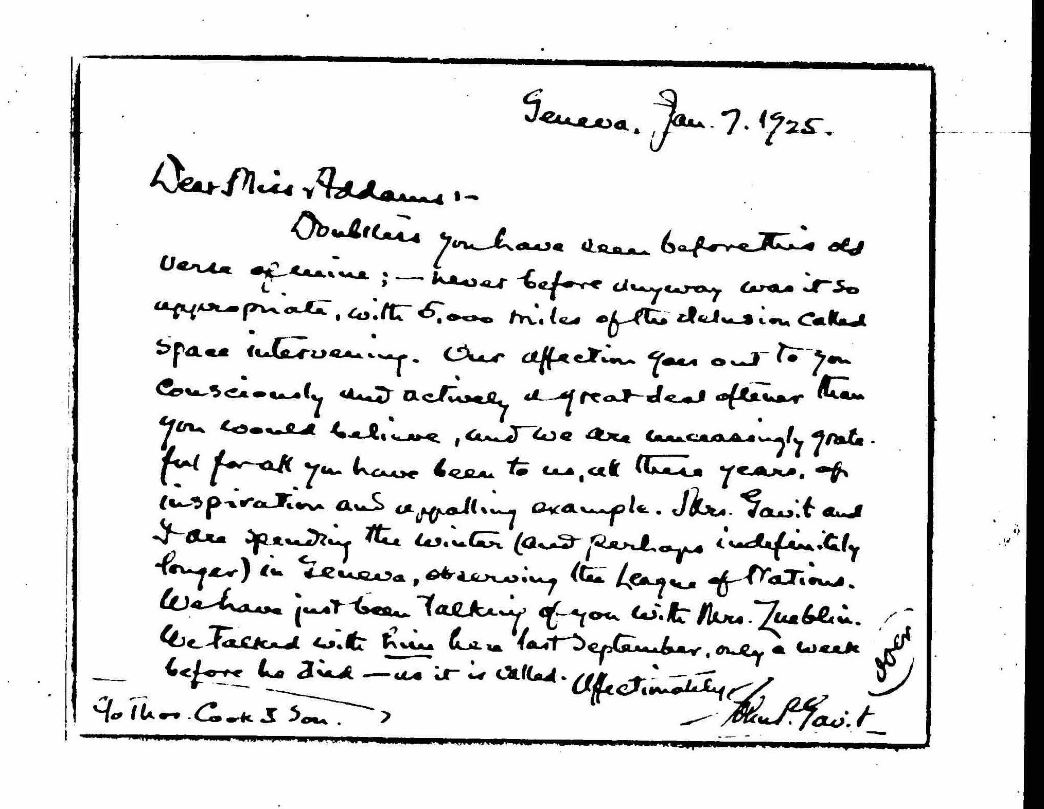 Doubtless you have seen before this old verse of mine; -- never before anyway was it so appropriate, with 5,000 miles of the delusion called space intervening. Our affection goes out to you consciously and actively a great deal oftener than you would believe, and we are unceasingly grateful for all you have been to us, all these years, of inspiration and [appalling?] example. Mrs. Gavit and I are spending the winter (and perhaps indefinitely longer) in Geneva, observing the League of Nations. We have just been talking of you with Mrs. Zueblin. We talked with him here last September, only a week before he died -- as it is called.