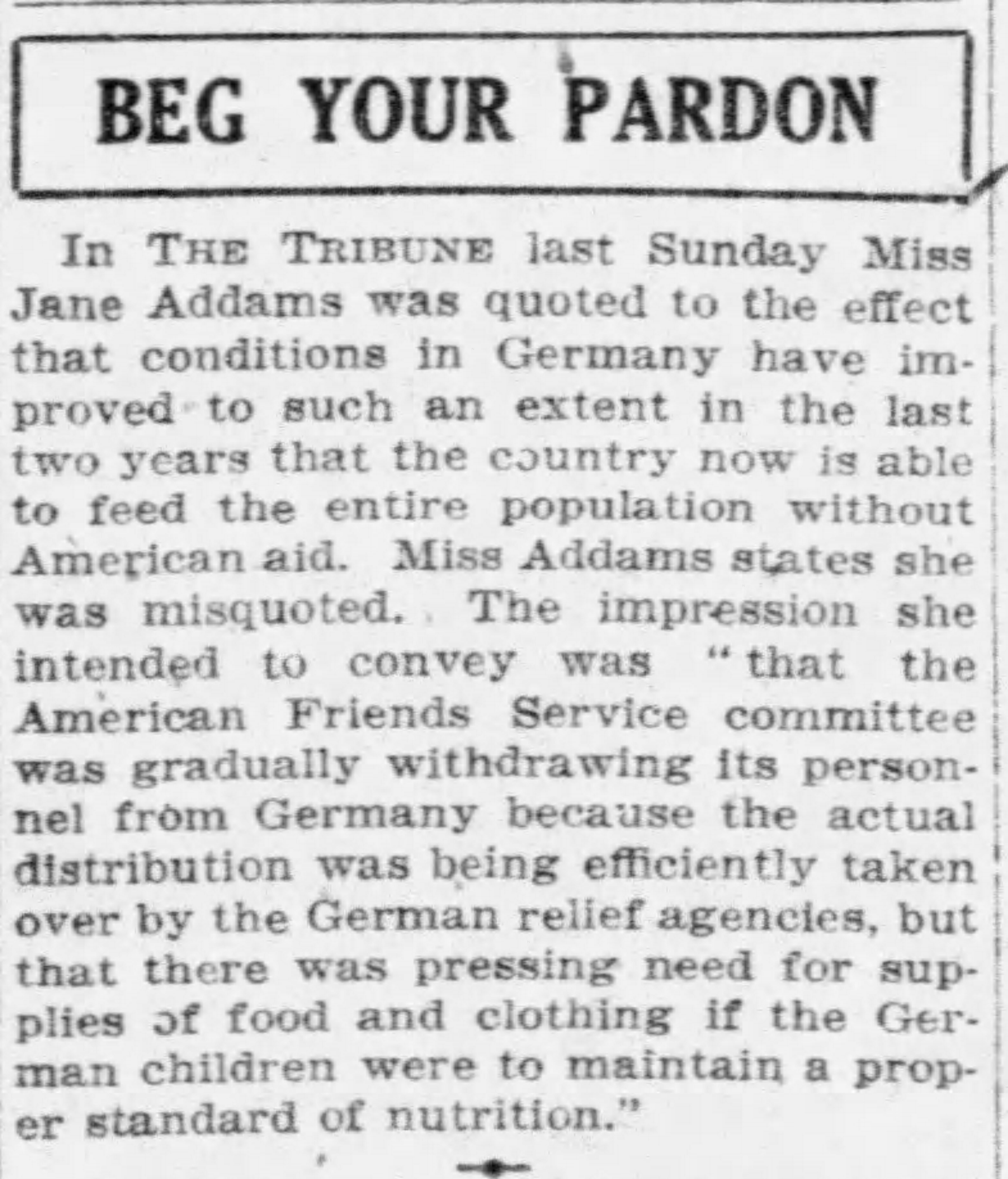 In THE TRIBUNE last Sunday Miss Jane Addams was quoted to the effect that conditions in Germany have improved to such an extent in the last two years that the country now is able to feed the entire population without American aid. Miss Addams states she was misquoted. The impression she intended to convey was “that the American Friends Service committee was gradually withdrawing its personnel from Germany because the actual distribution was being efficiently taken over by the German relief agencies, but that there was pressing need for supplies of food and clothing if the German children were to maintain a proper standard of nutrition.”