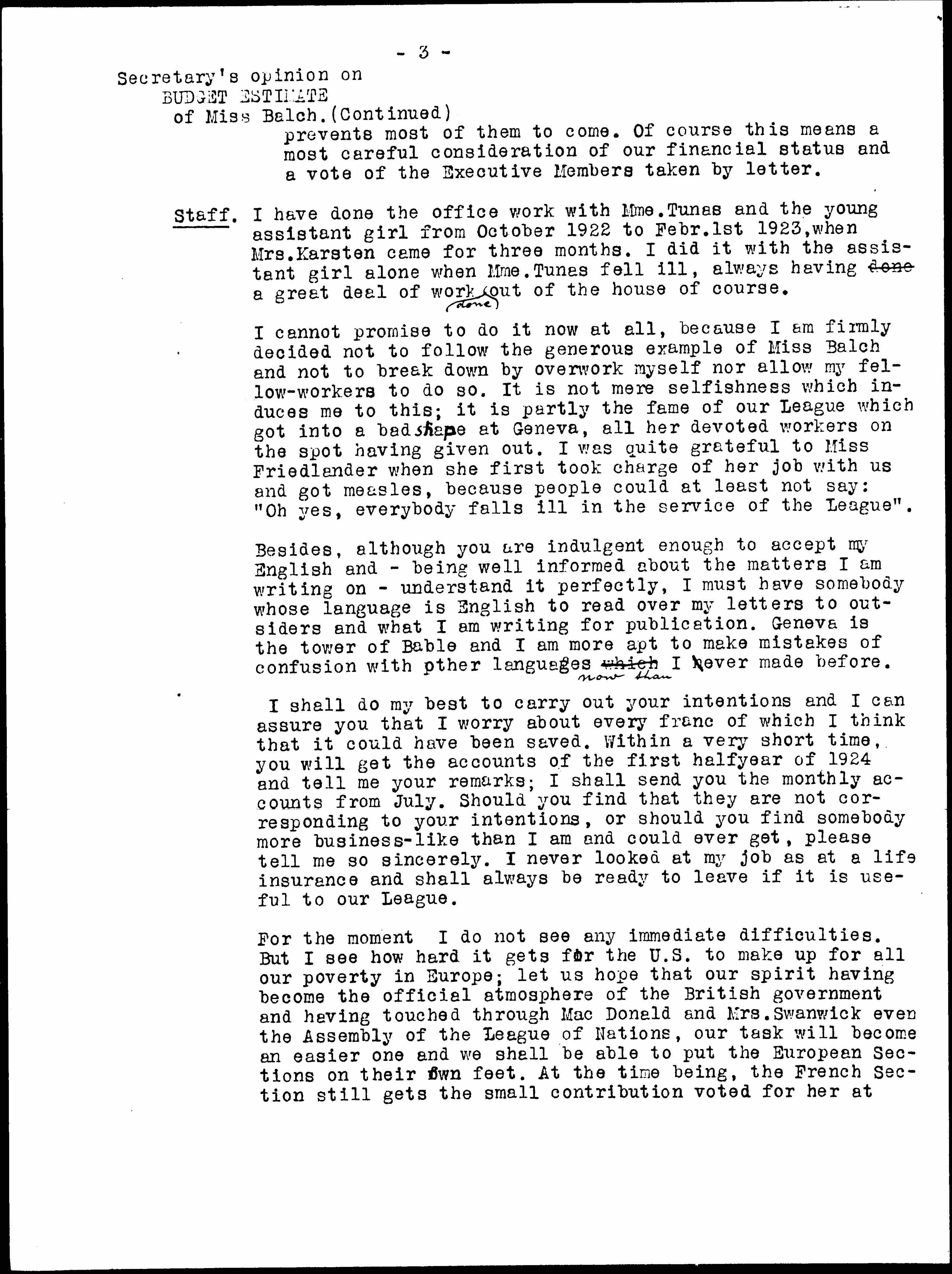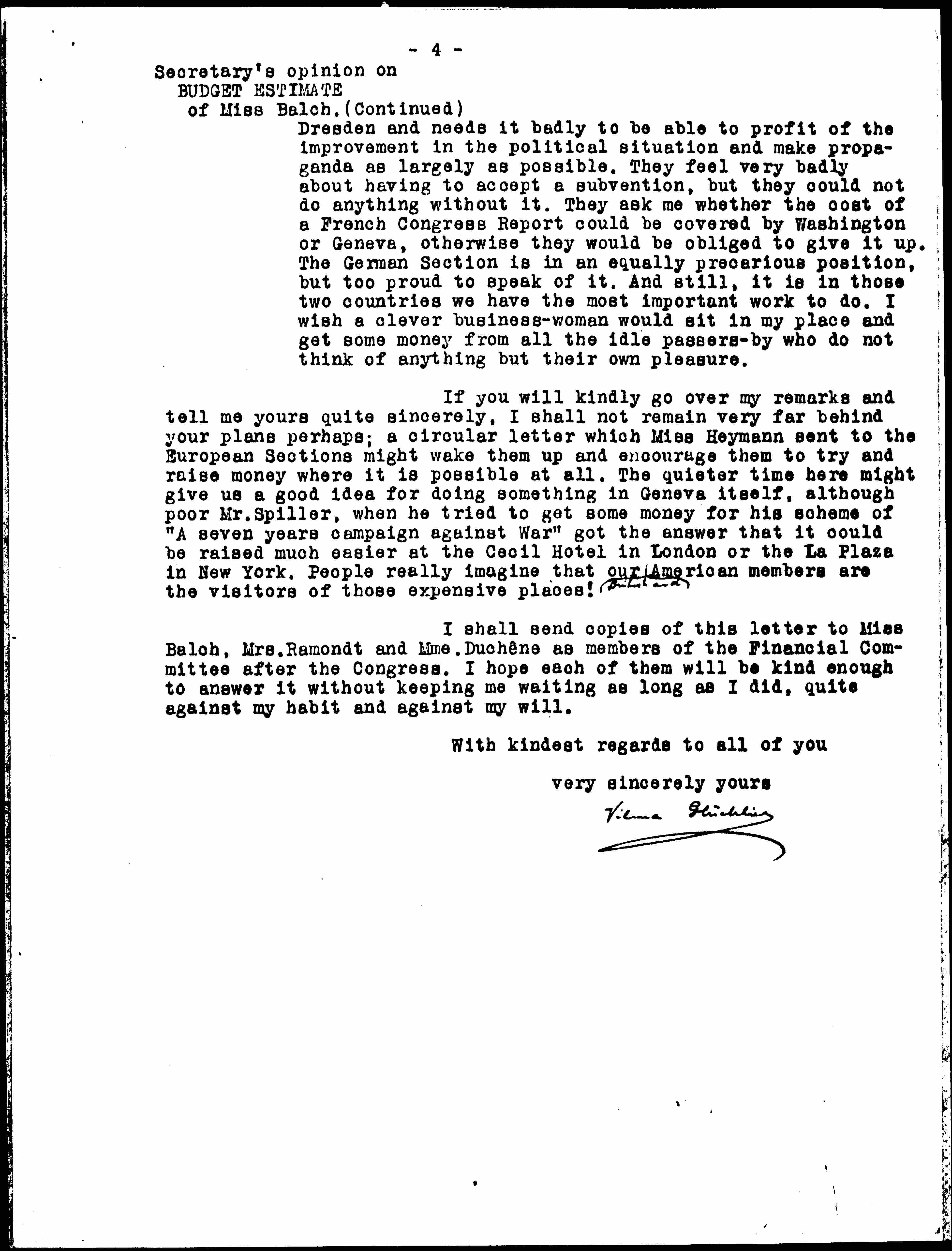 For the moment I do not see any immediate difficulties. But I see how hard it gets for the U.S. to make up for all our poverty in Europe; let us hope that our spirit having become the official atmosphere of the British government and having touched through MacDonald and Mrs. Swanwick even the Assembly of the League of Nations, our task will become an easier one and we shall be able to put the European Sections on their own feet. At the time being, the French Section still gets the small contribution voted for her at [page 4] Dresden and needs it badly to be able to profit of the improvement in the political situation and make propaganda as largely as possible. They feel very badly about having to accept a subvention, but they could not do anything without it. They ask me whether the cost of a French Congress Report could be covered by Washington or Geneva, otherwise they would be obliged to give it up. The German Section is in an equally precarious position, but too proud to speak of it. And still, it is in those two countries we have the most important work to do. I wish a clever business-woman would sit in my place and get some money from all the idle passers-by who do not think of anything but their own pleasure.