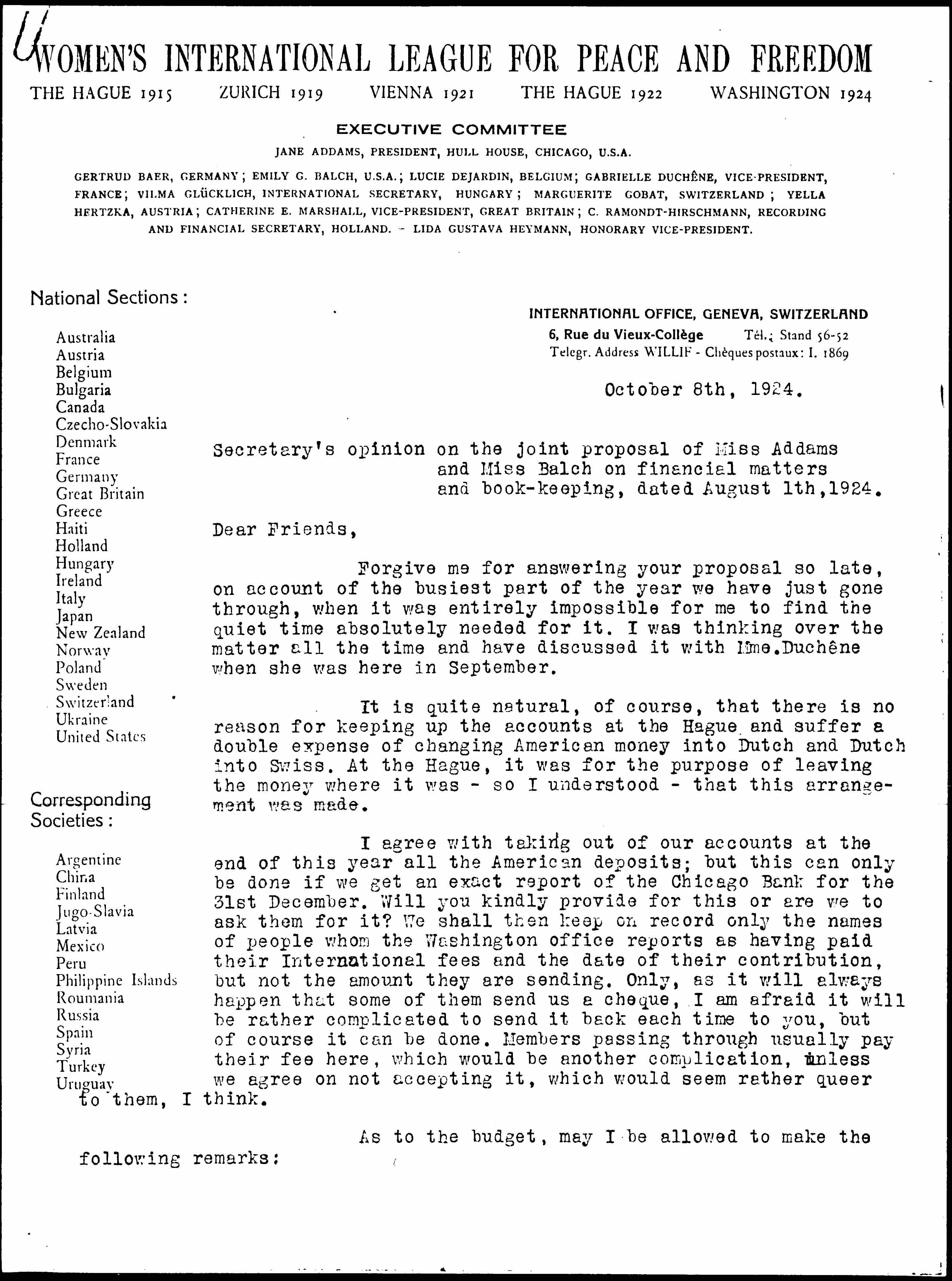 I shall send copies of this letter to Miss Balch, Mrs. Ramondt and Mme. Duchêne as members of the Financial Committee after the Congress. I hope each of them will be kind enough to answer it without keeping me waiting as long as I did, quite against my habit and against my will.