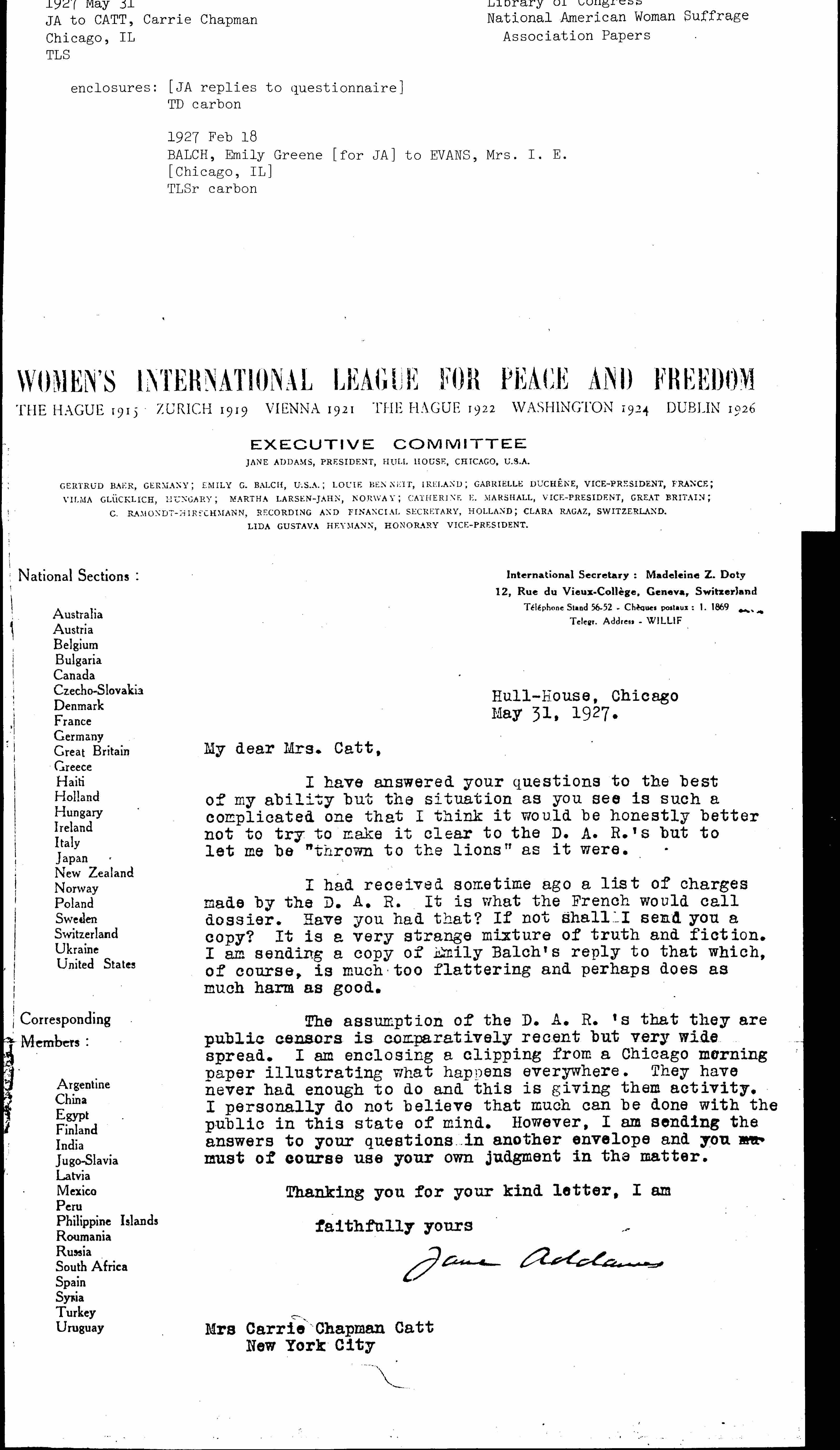 I had received sometime ago a list of charges made by the D.A.R. It is what the French would call dossier. Have you had that? If not shall I send you a copy? It is a very strange mixture of truth and fiction. I am sending a copy of Emily Balch's reply to that which, of course, is much too flattering and perhaps does as much harm as good.