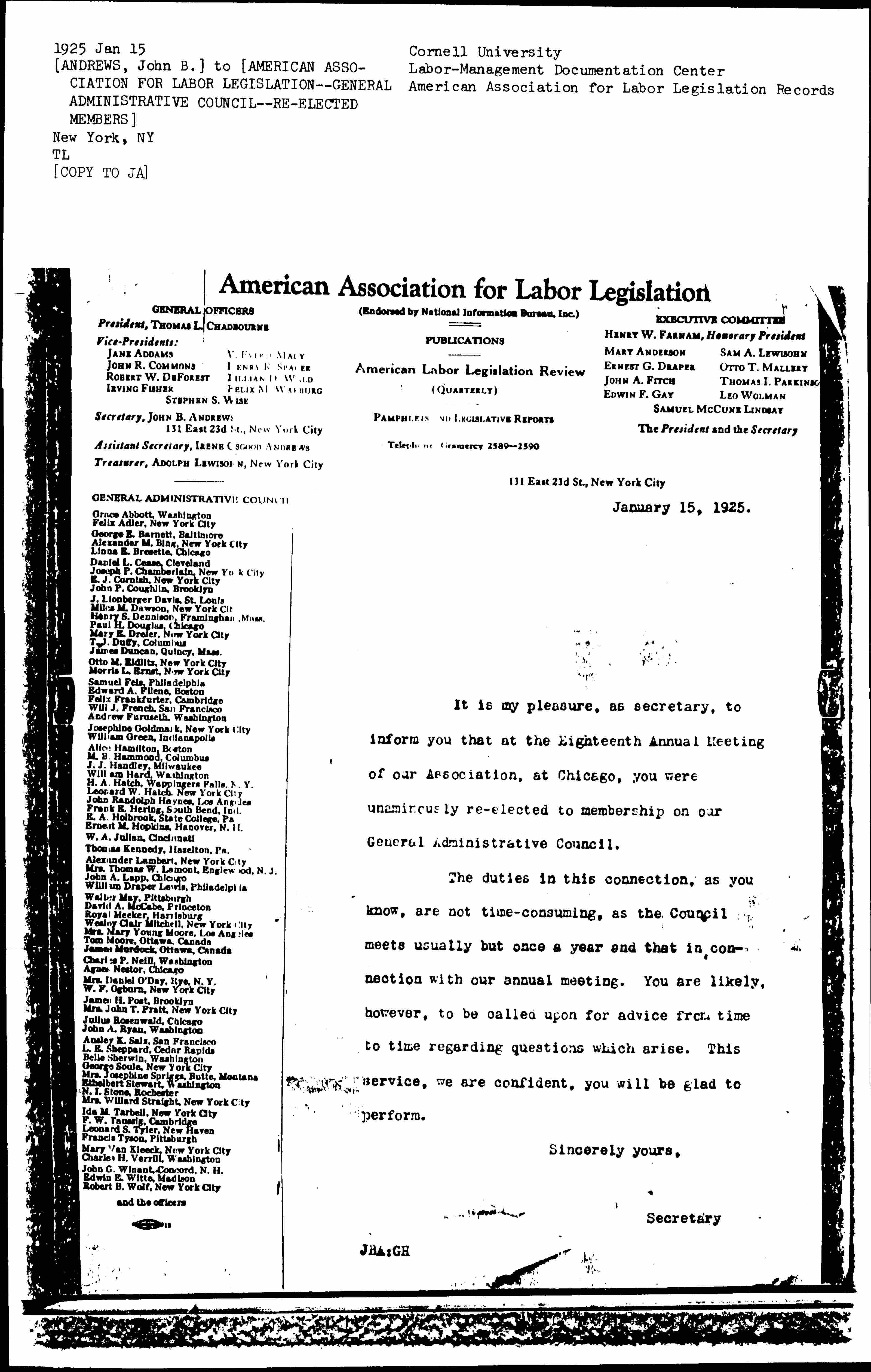 It is my pleasure, as secretary, to inform you that at the Eighteenth Annual Meeting of our Association, at Chicago, you were unanimously [reelected] to membership on our General Administrative Council.