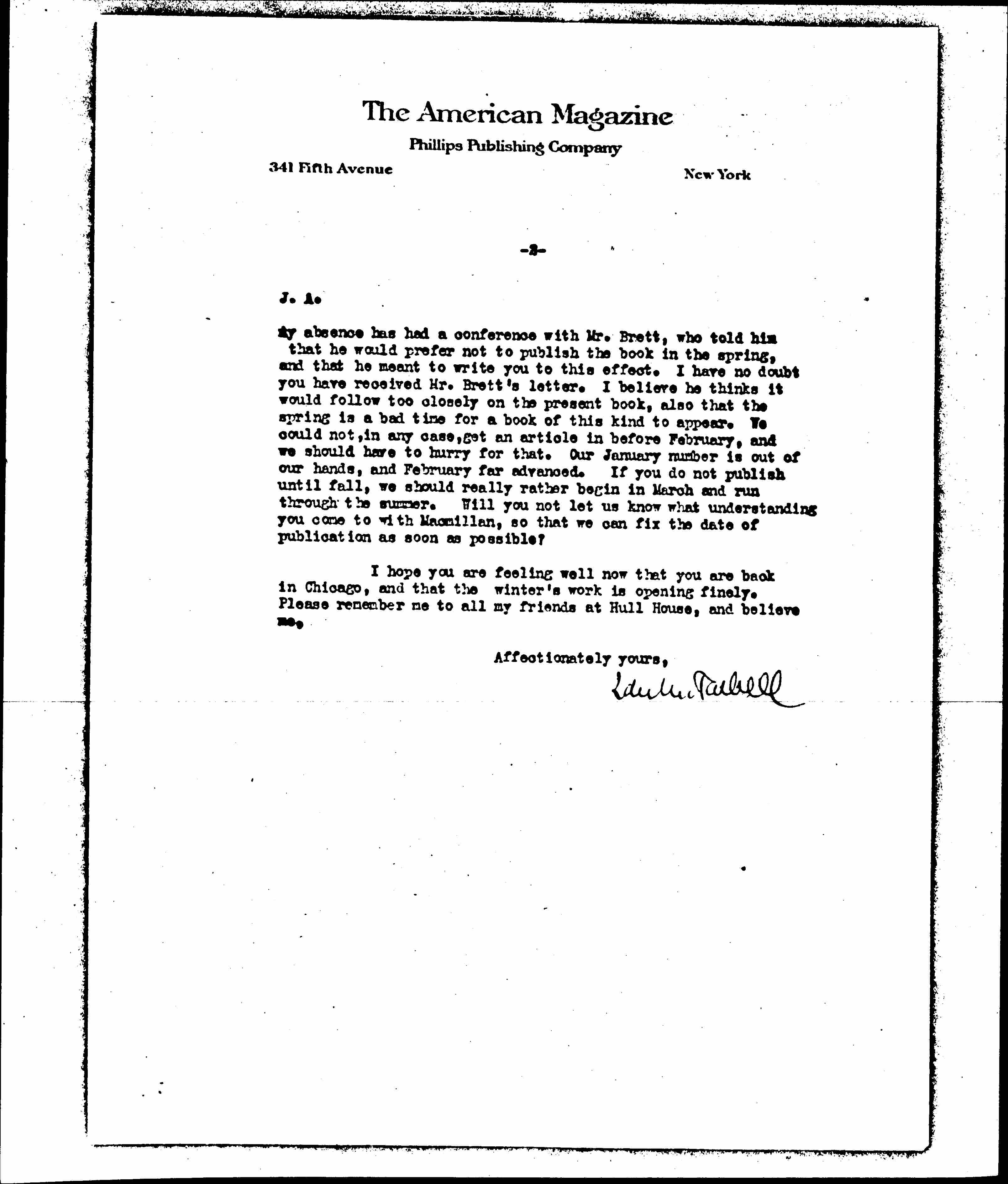 Of course the first chapter could be put into type almost immediately. I find that Mr. Phillips in [page 2] my absence has had conference with Mr. Brett, who told him that he would prefer not to publish the book in the spring, and that he meant to write you to this effect. I have no doubt you have received Mr. Brett's letter. I believe he thinks it would follow too closely on the present book, also that the spring is a bad time for a book of this kind to appear. We could not, in any case, get an article in before February, and we should have to hurry for that. Our January number is out of our hands, and February far advanced. If you do not publish until fall, we should really rather begin in March and run throughthe summer. Will you not let us know what understanding you come to with Macmillan, so that we can fix the date of publication as soon as possible?