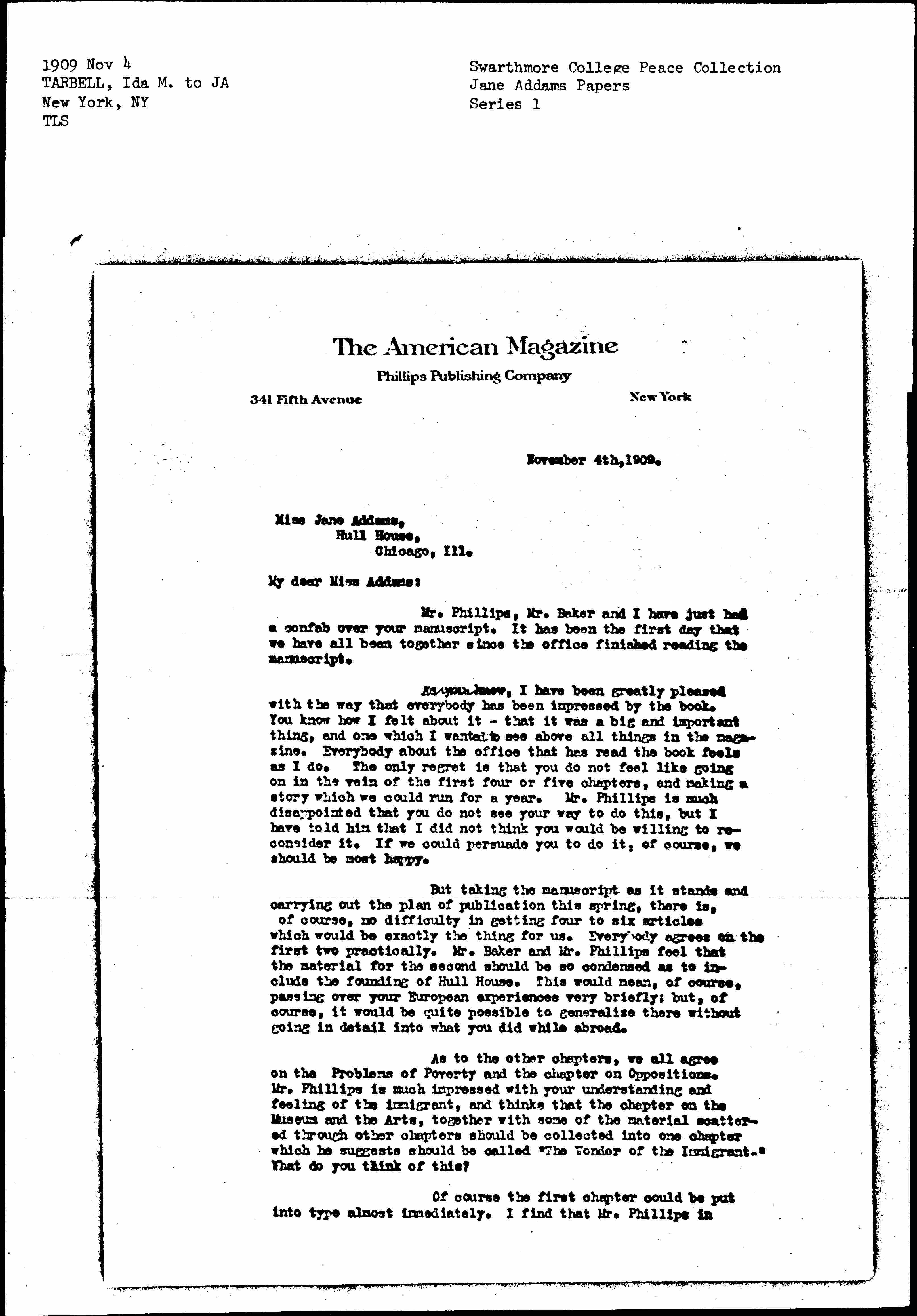 But taking the manuscript as it stands and carrying out the plan of publication this spring, there is, of course, no difficulty in getting four to six articles which would be exactly the thing for us. Everybody agrees on the first two practically. Mr. Baker and Mr. Phillips feel that the material for the second should be so condensed as to include the founding of Hull House. This would mean, of course, passing over your European experiences very briefly; but, of course, it would be quite possible to generalize there without going in detail into what you did abroad.