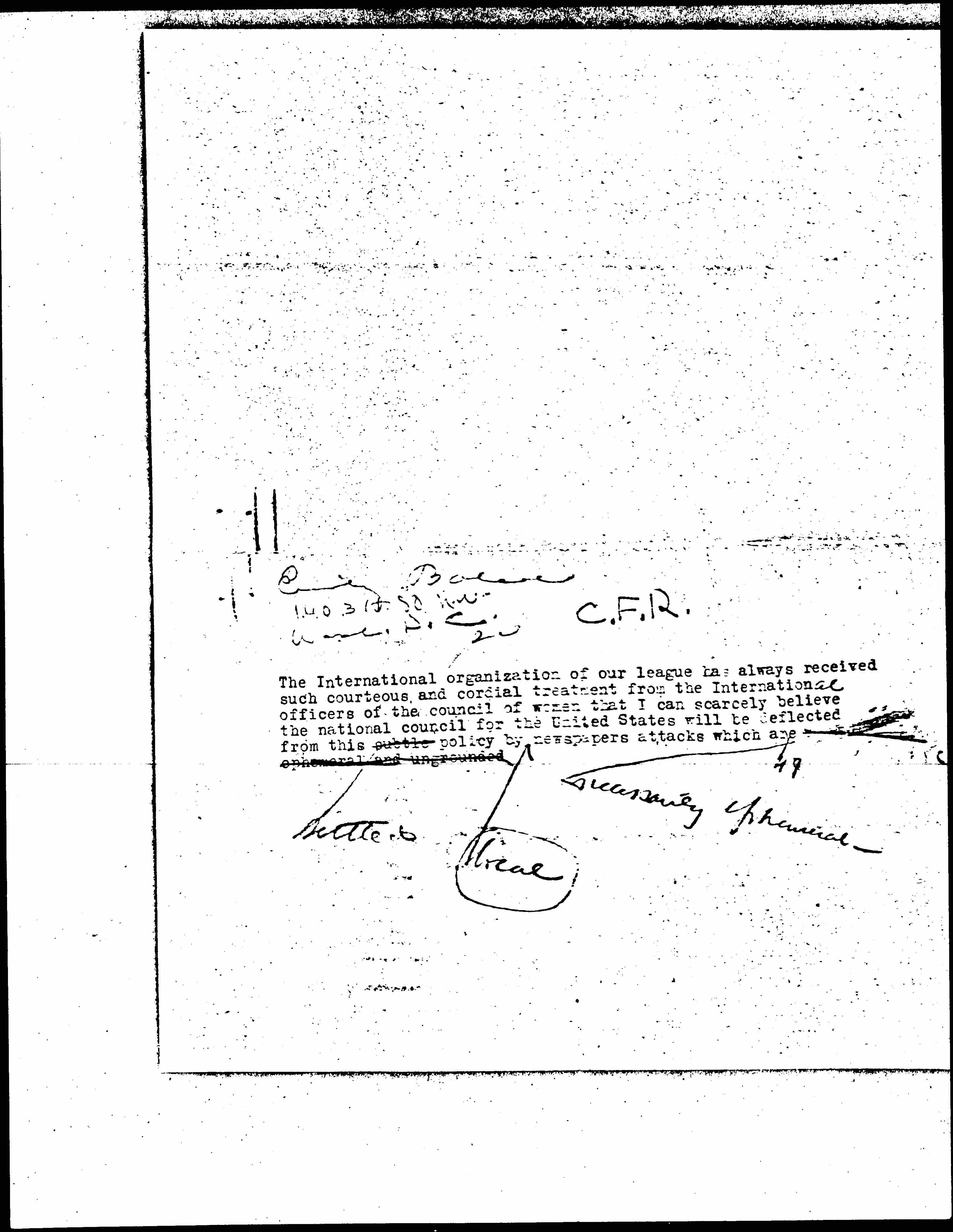 The International organization of our League has always received such courteous and cordial treatment from the International officers of the council of women that I can scarcely believe the national council for the United States will be deflected from this subtle ↑settled↓ policy by ↑local↓ newspaper attacks which are ephemeral and ungrounded ↑necessarily ephemeral↓.