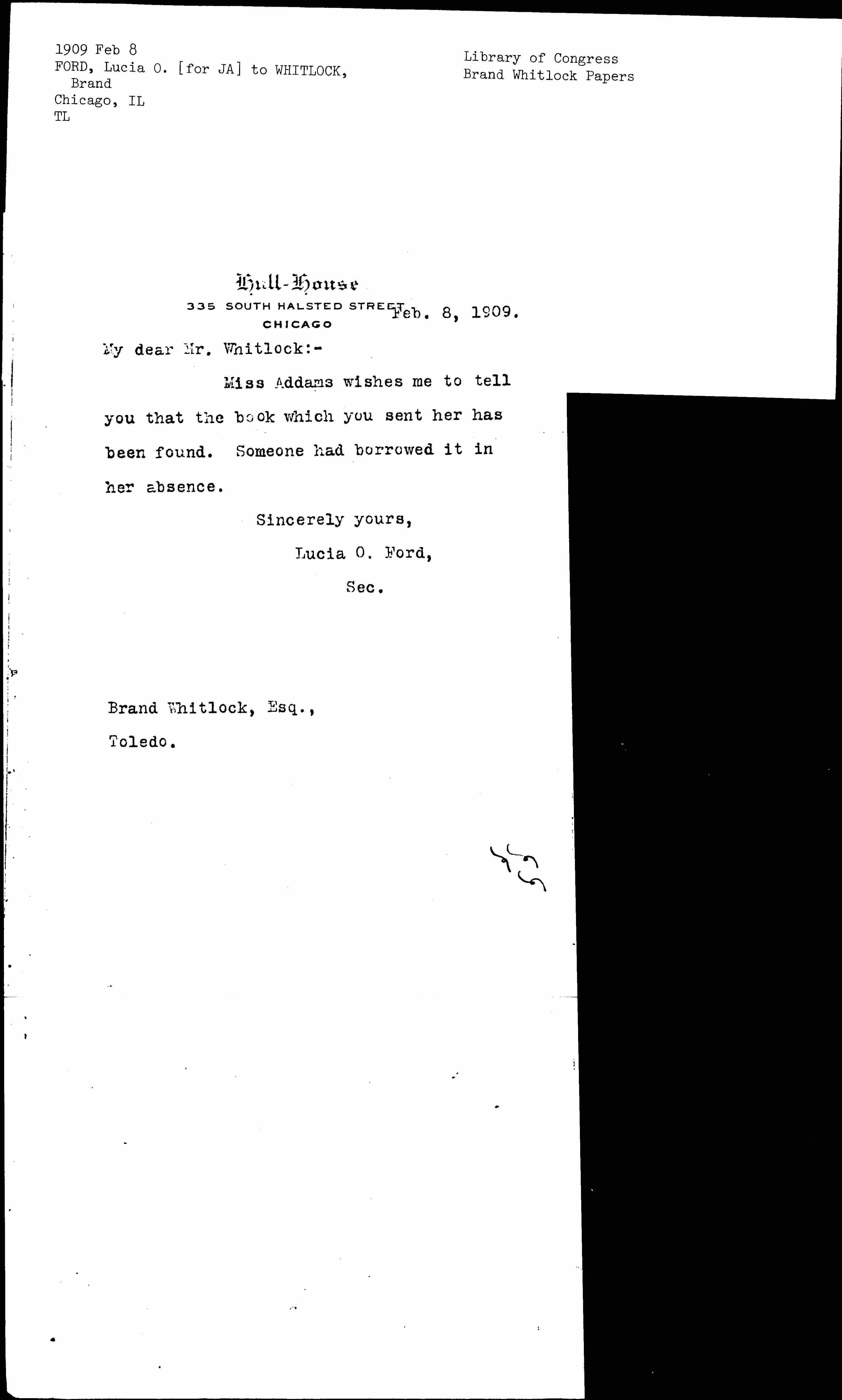 Miss Addams wishes me to tell you that the book which you sent her has been found. Someone had borrowed it in her absence.