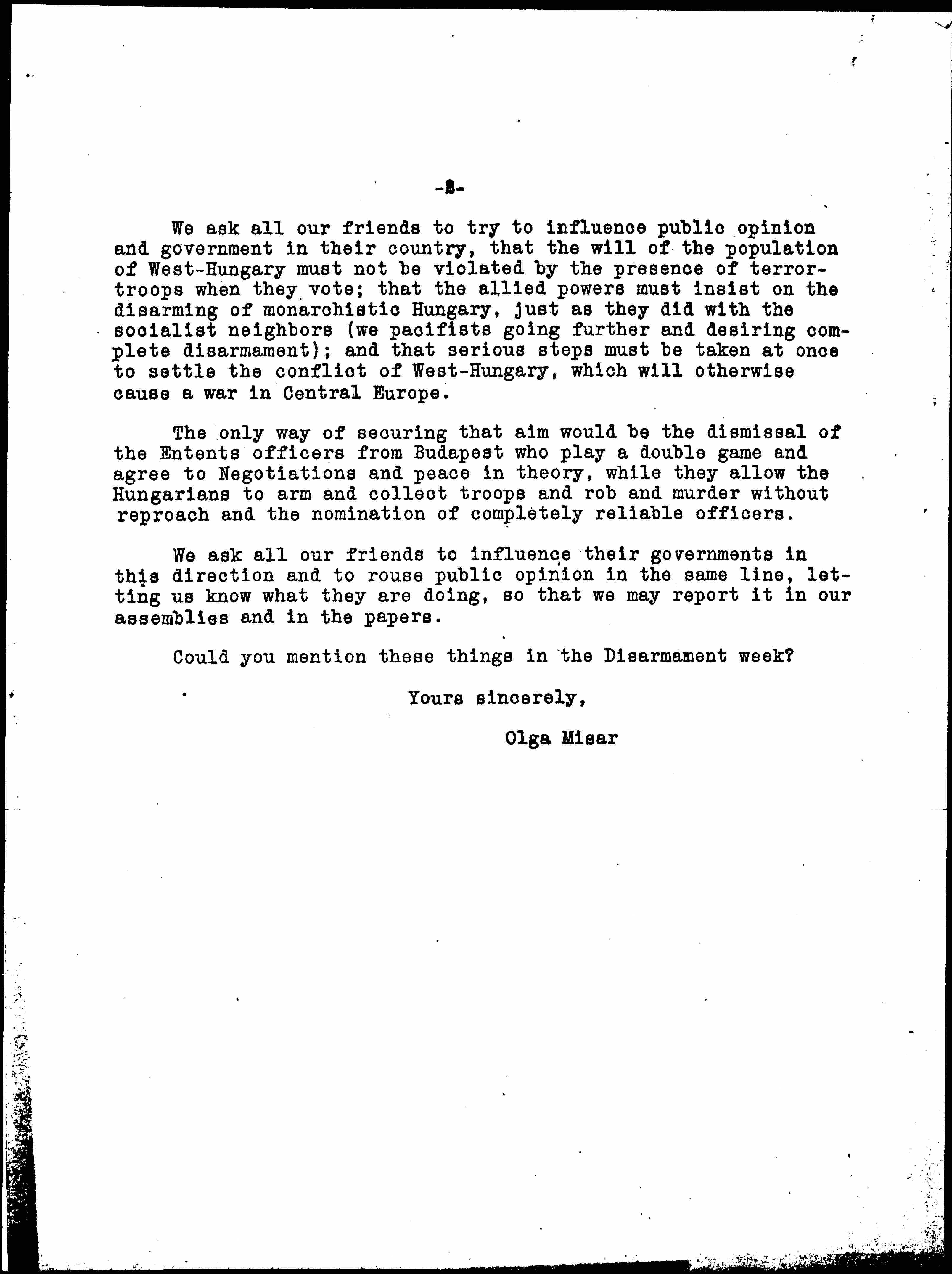 We ask all our friends to try to influence public opinion and government in their country, that the will of the population of West-Hungary must not be violated by the presence of the terror-troops when they vote; that the allied powers must insist on the disarming of monarchistic Hungary, just as they did with the socialist neighbors (we pacifists going further and desiring complete disarmament); and that serious steps must be taken at once to settle the conflict of West-Hungary, which will otherwise cause a war in Central Europe.