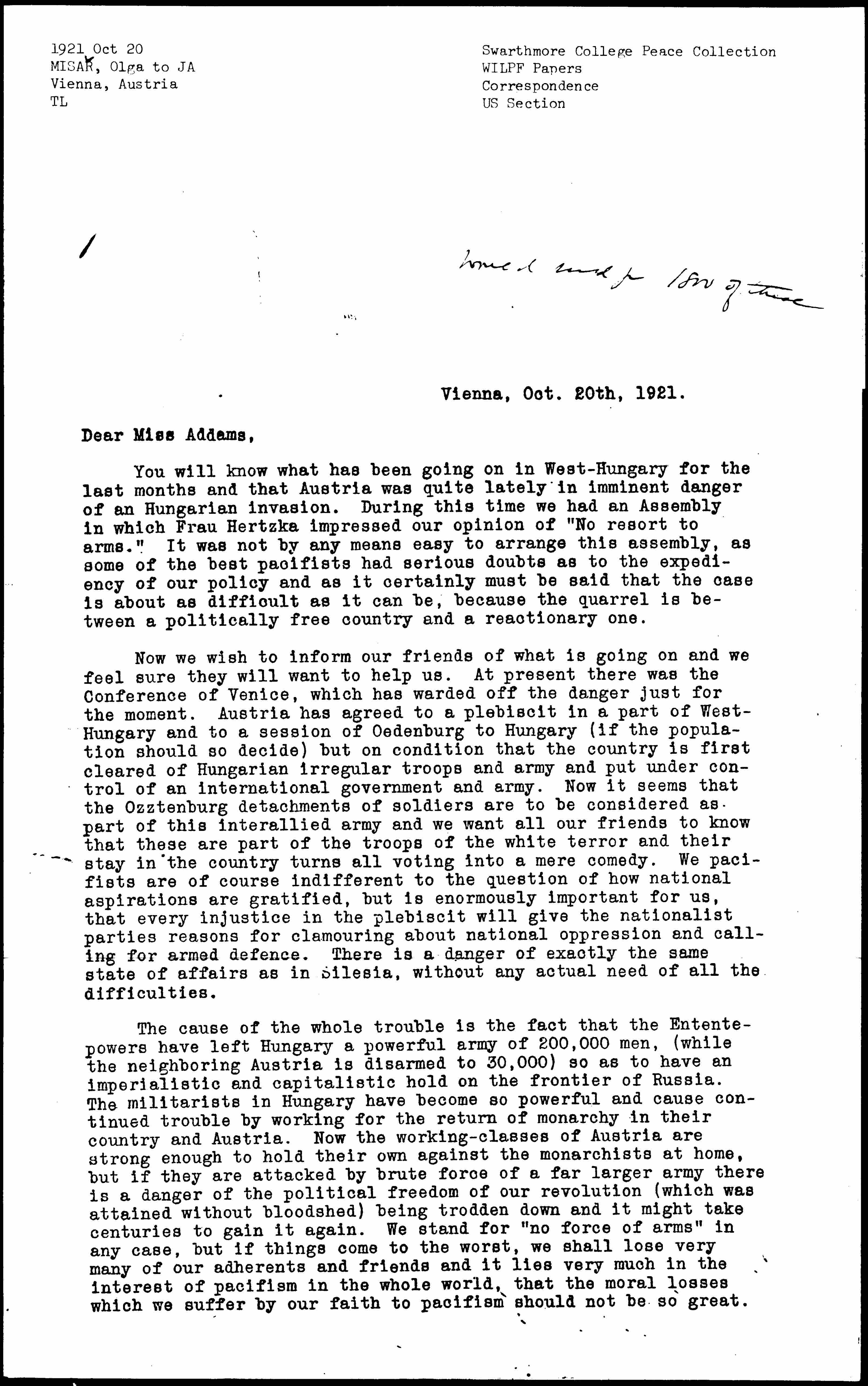 Now we wish to inform our friends of what is going on and we feel sure they will want to help us. At present there was the Conference of Venice, which has warded off the danger just for the moment. Austria has agreed to a [plebiscite] in a part of West-Hungary and to a session of Oedenburg to Hungary (if the population should so decide) but on condition that the country is first cleared of Hungarian irregular troops and army and put under control of an international government and army. Now it seems that the [Oostenburg?] detachments of soldiers are to be considered as part of this [inter-allied] army and we want all our friends to know that these are part of the troops of the white terror and their stay in the country turns all voting into a mere comedy. We pacifists are of course indifferent to the question of how national aspirations are gratified, but is enormously important for us, that every injustice in the [plebiscite] will give the nationalist parties reasons for [clamoring] about national oppression and calling for armed [defense]. There is a danger of exactly the same state of affairs as in Silesia, without any actual need of all the difficulties.
