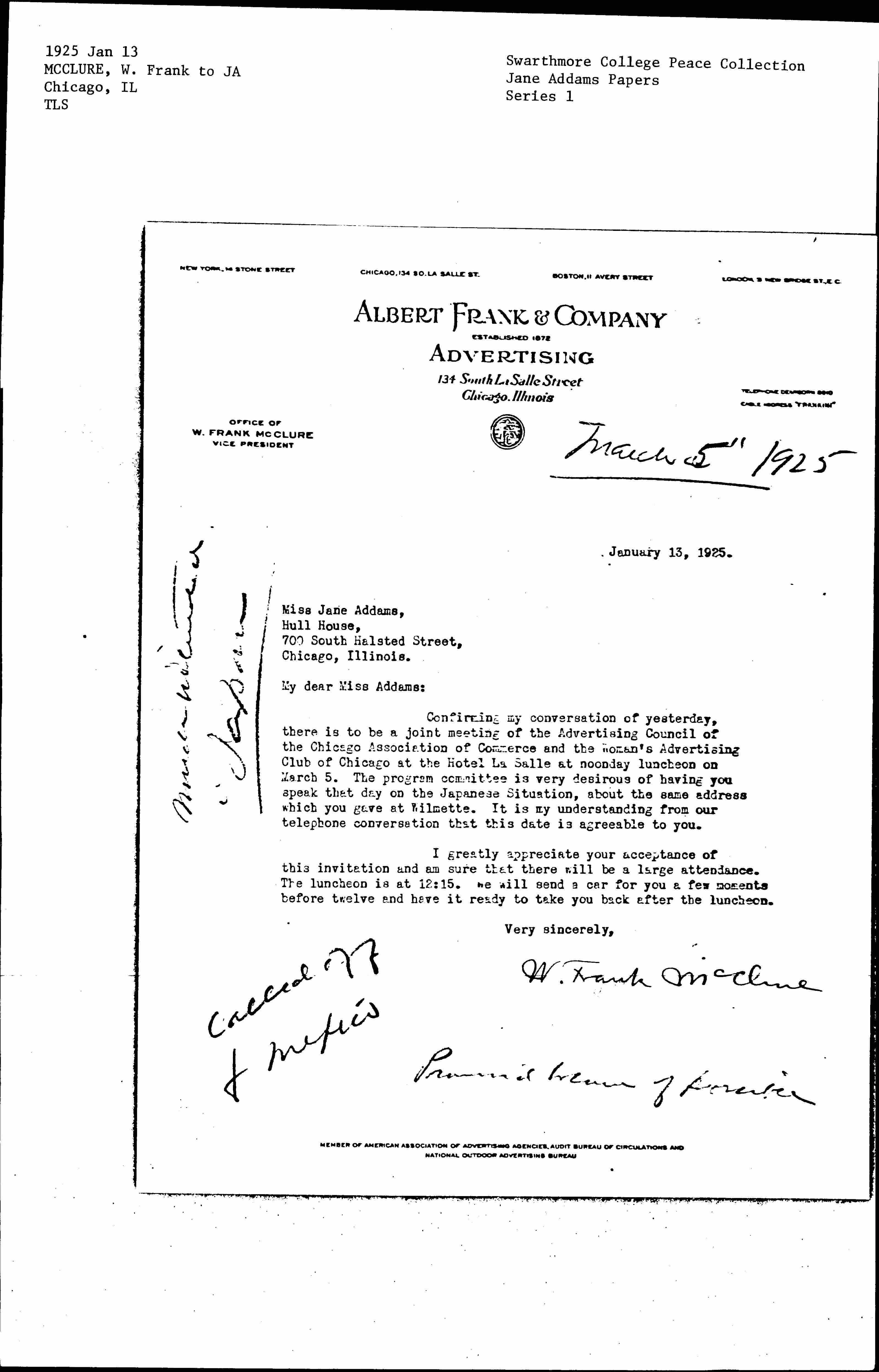 Confirming my conversation of yesterday, there is to be a joint meeting of the Advertising Council of the Chicago Association of Commerce and the Woman's Advertising Club of Chicago at the Hotel La Salle at noonday luncheon on March 5. The program committee is very desirous of having you speak that day on the Japanese Situation, about the same address which you gave at Wilmette. It is my understanding from our telephone conversation that this date is agreeable to you.