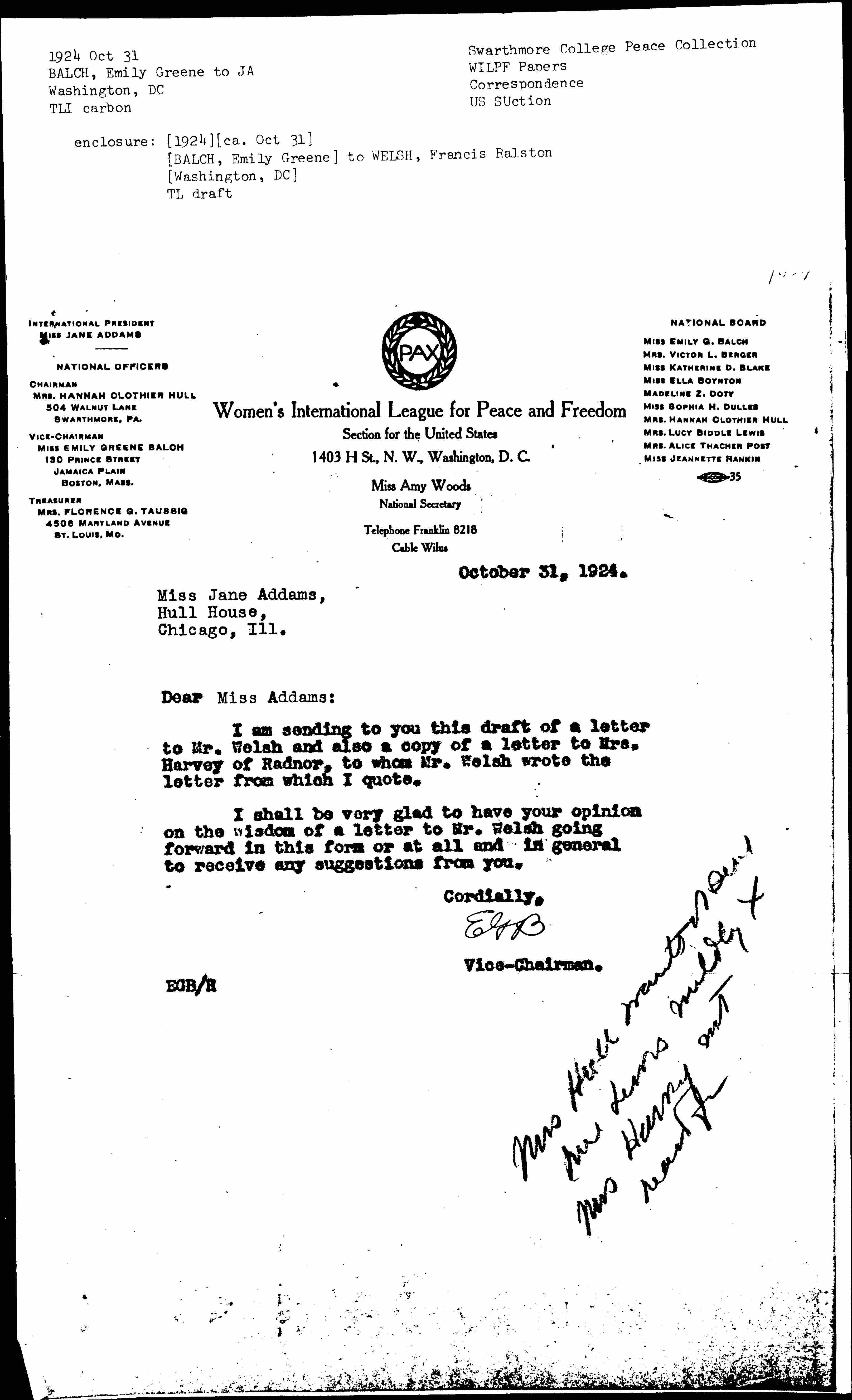 I am sending to you this draft of a letter to Mr. Welsh and also a copy of a letter to Mrs. Harvey of Radnor, to whom Mr. Welsh wrote the letter from which I quote.