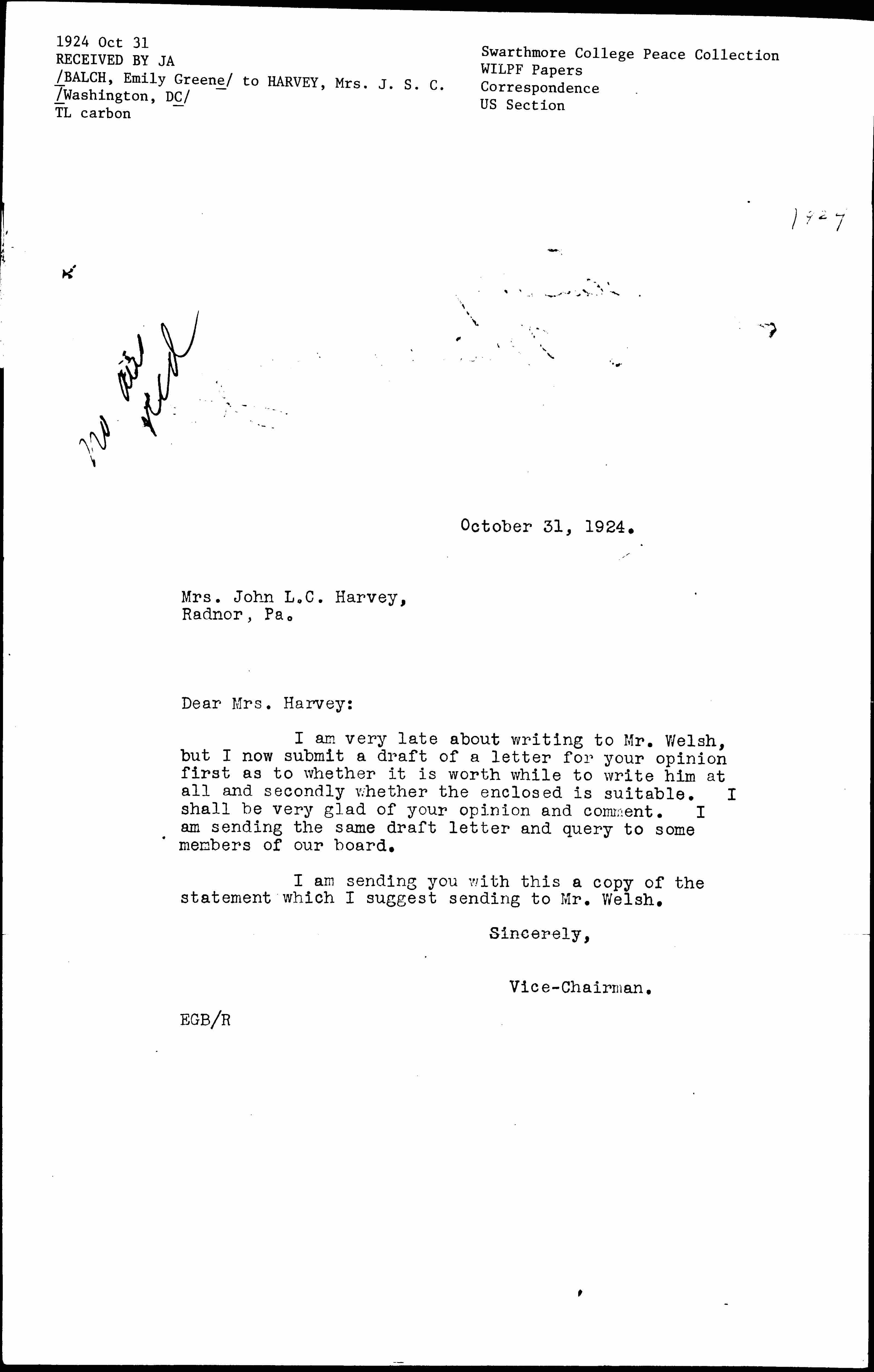 I am very late about writing to Mr. Welsh, but I now submit a draft of a letter for your opinion first as to whether it is worth while to write him at all and secondly whether the enclosed is suitable. I shall be very glad of your opinion and comment. I am sending the same draft letter and query to some members of our board.