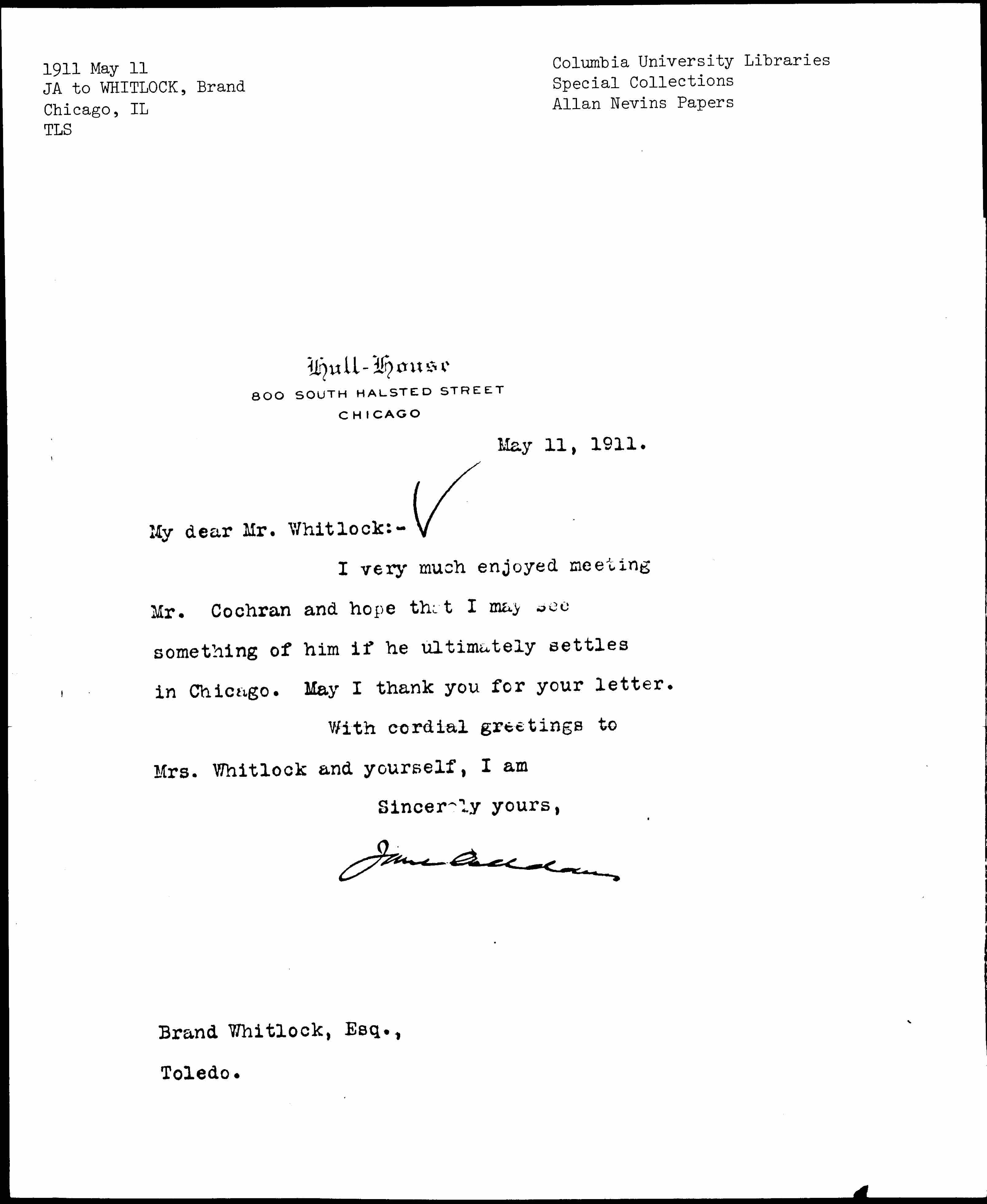 I very much enjoyed meeting Mr. Cochran and hope that I may see something of him if he ultimately settles in Chicago. May I thank you for your letter.