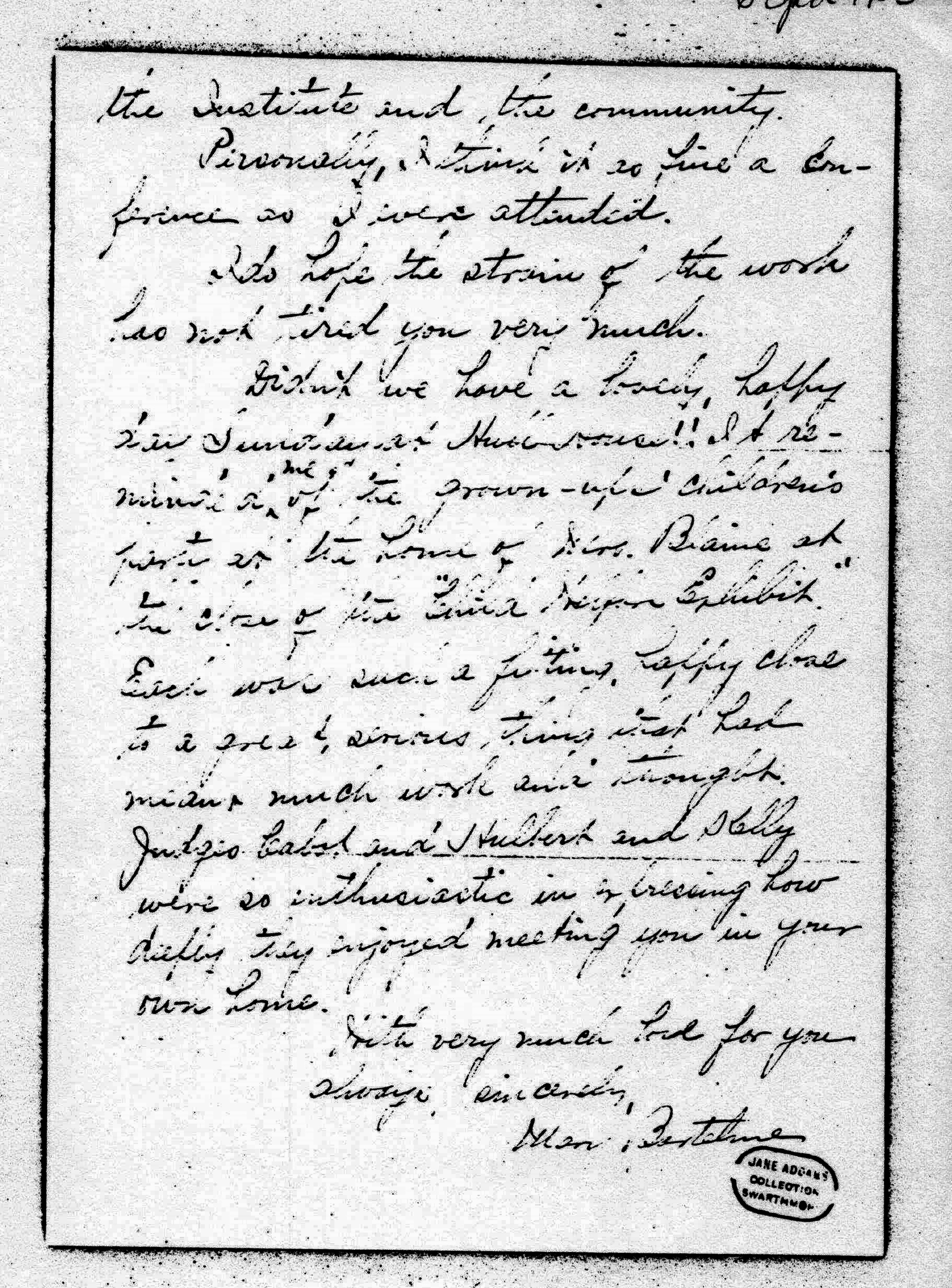 Didn't we have a lovely, happy day Sunday at Hull-House!! It reminded ↑me↓ of the grown-up children's party at the home of Mrs. Blaine at the close of the "Child Welfare Exhibit." Each was such a fitting, happy close to a great, serious thing that had meant much work and thought. Judges Cabot and Hulbert and Kelly were so enthusiastic in expressing how deeply they enjoyed meeting you in your own home.
