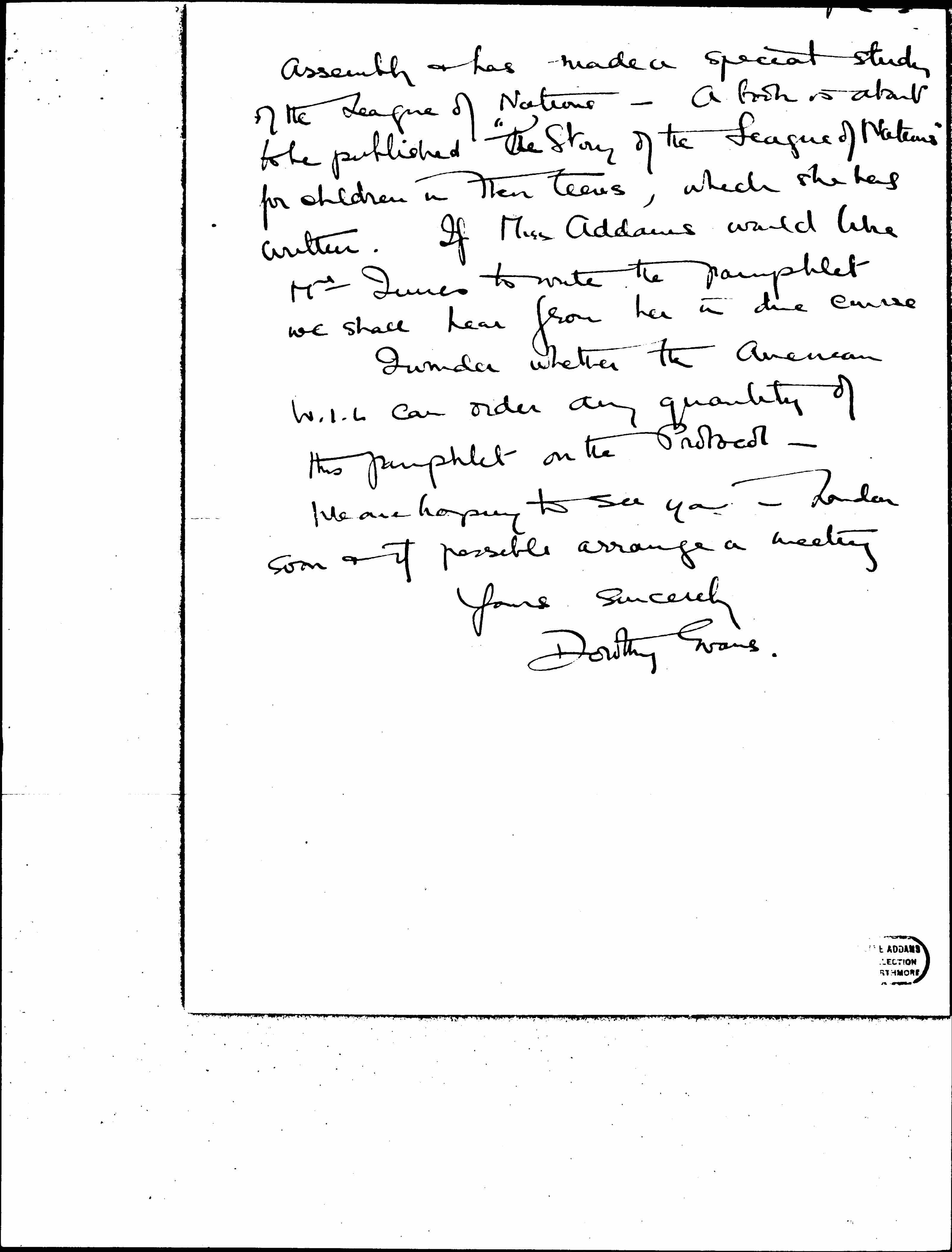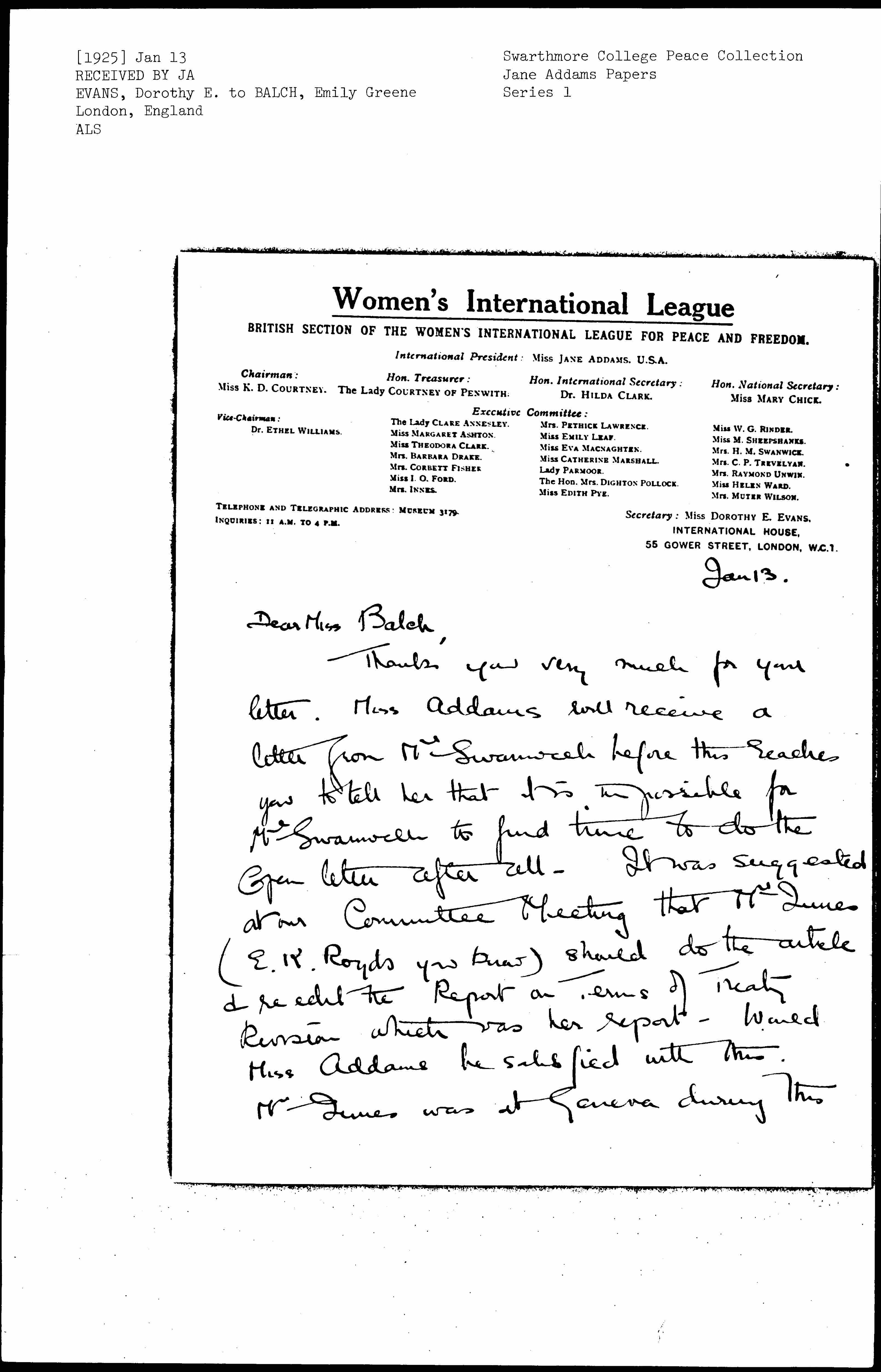 Thank you very much for your letter. Miss Addams will receive a letter from Mrs Swanwick before this reaches you to tell her that it is impossible for Mrs Swanwick to find time to do the open letter after all. It was suggested at our Committee Meeting that Mrs Innes (E. R. Royds you know) should do the article & reedit the Report on Terms of Treaty Revision which was her report. Would Miss Addams be satisfied with this. Mrs Innes was at Geneva during this [page 2] assembly & has made a special study of the League of Nations -- a book is about to be published "The Story of the League of Nations" for children in their teens, which she has written. If Miss Addams would like Mrs Innes to write the pamphlet we shall hear from her in due course.