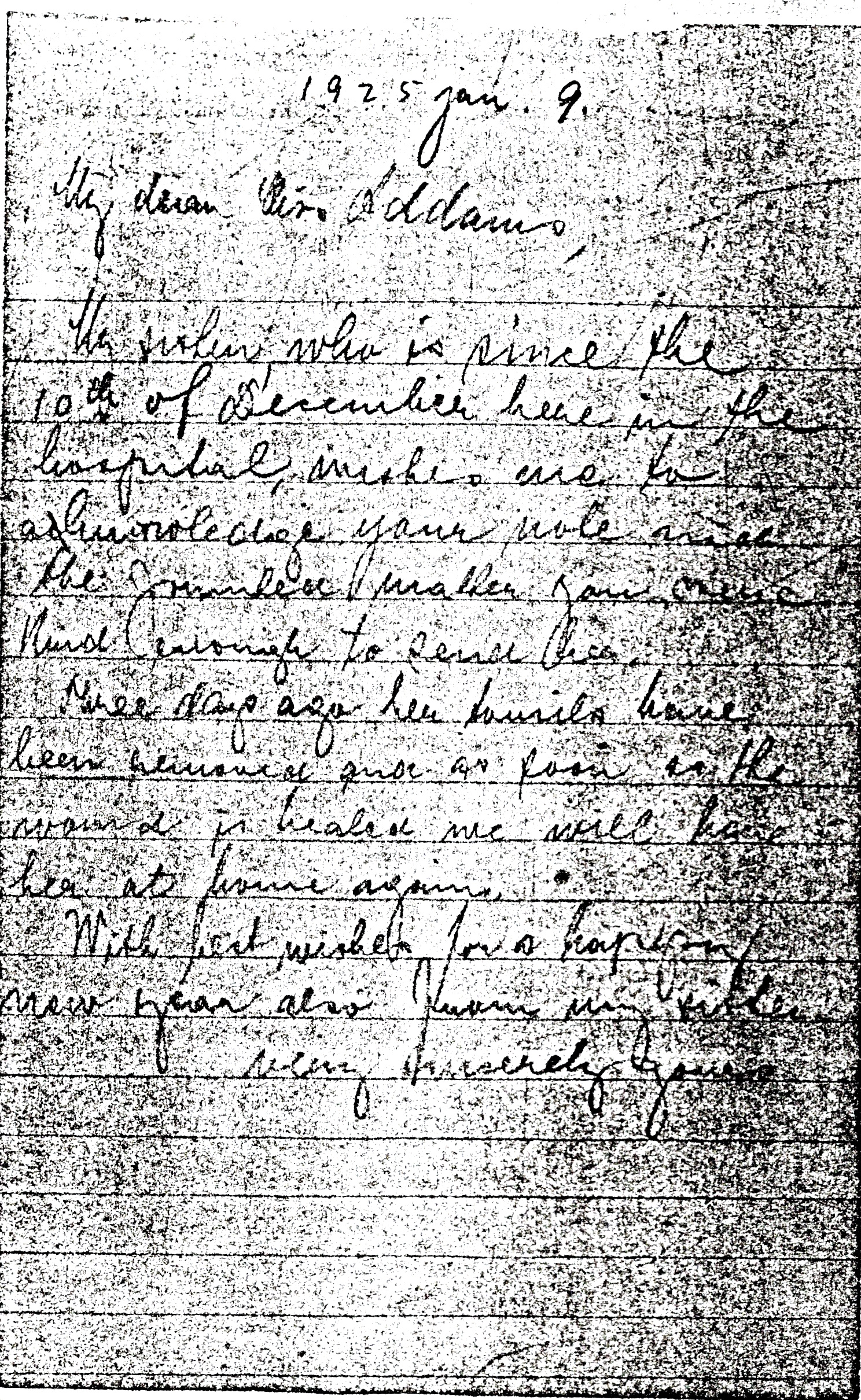 My sister who is since the 10th of December here in the hospital, wishes me to acknowledge your note and the [illegible] [matter?] you were kind enough to send her.