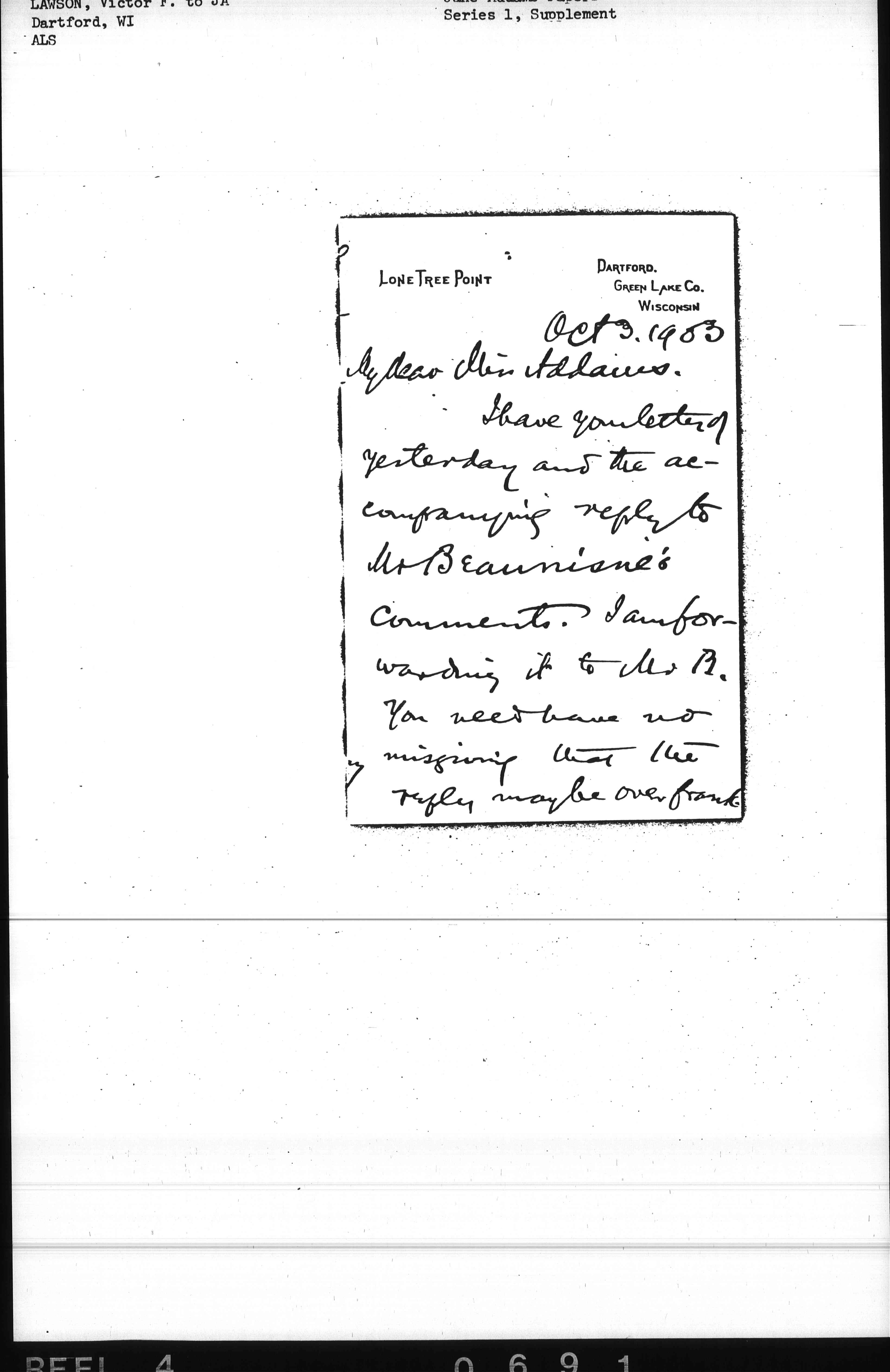 I have your letter of yesterday and the accompanying reply to Mr Beaunisne's comments. I am forwarding it to Mr B. You need have no misgiving that the reply maybe over frank. [page 2] The subject under consideration is serious, in both its moral and its business aspects, and must be dealt with in entire frankness and freedom.