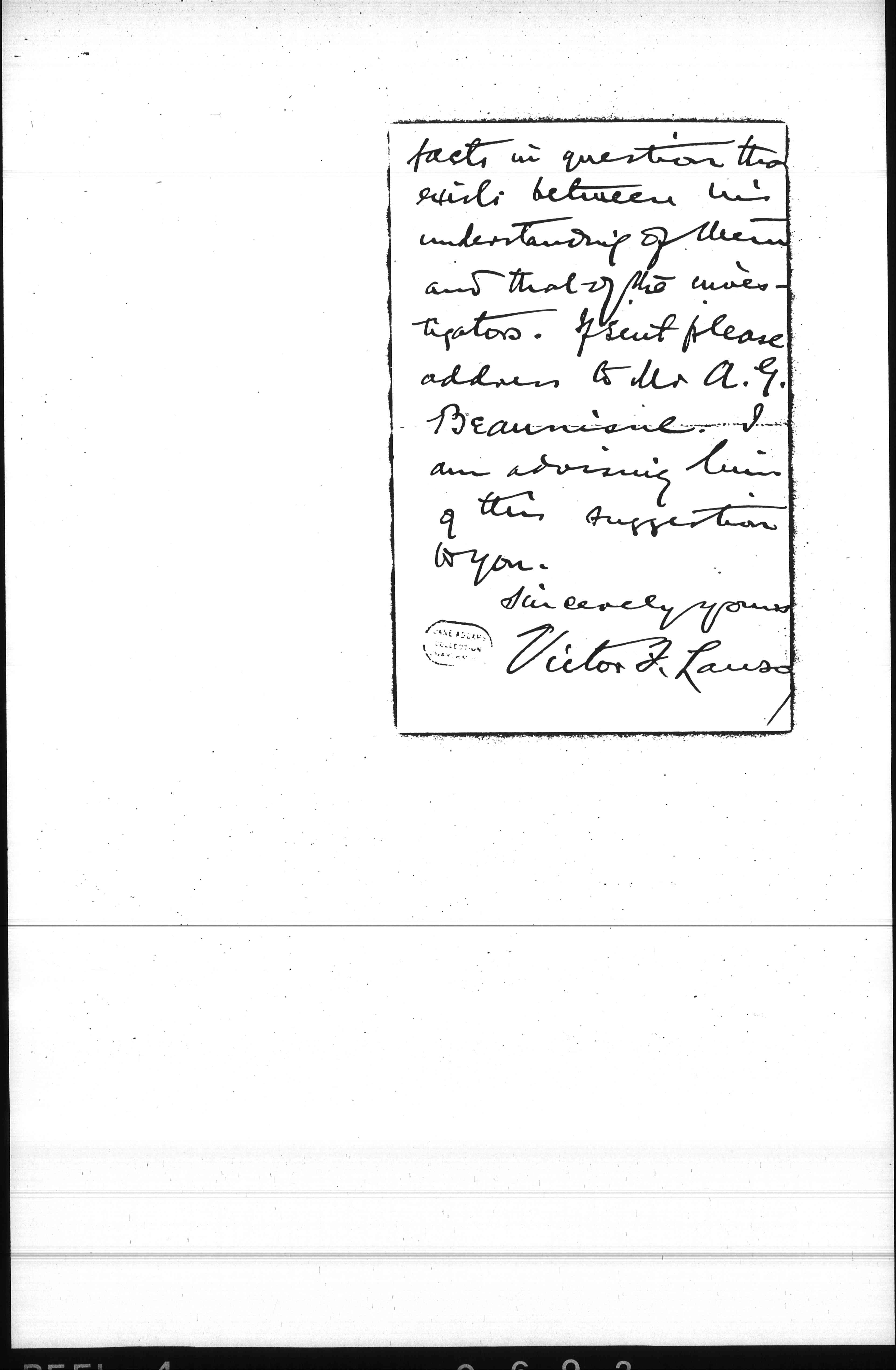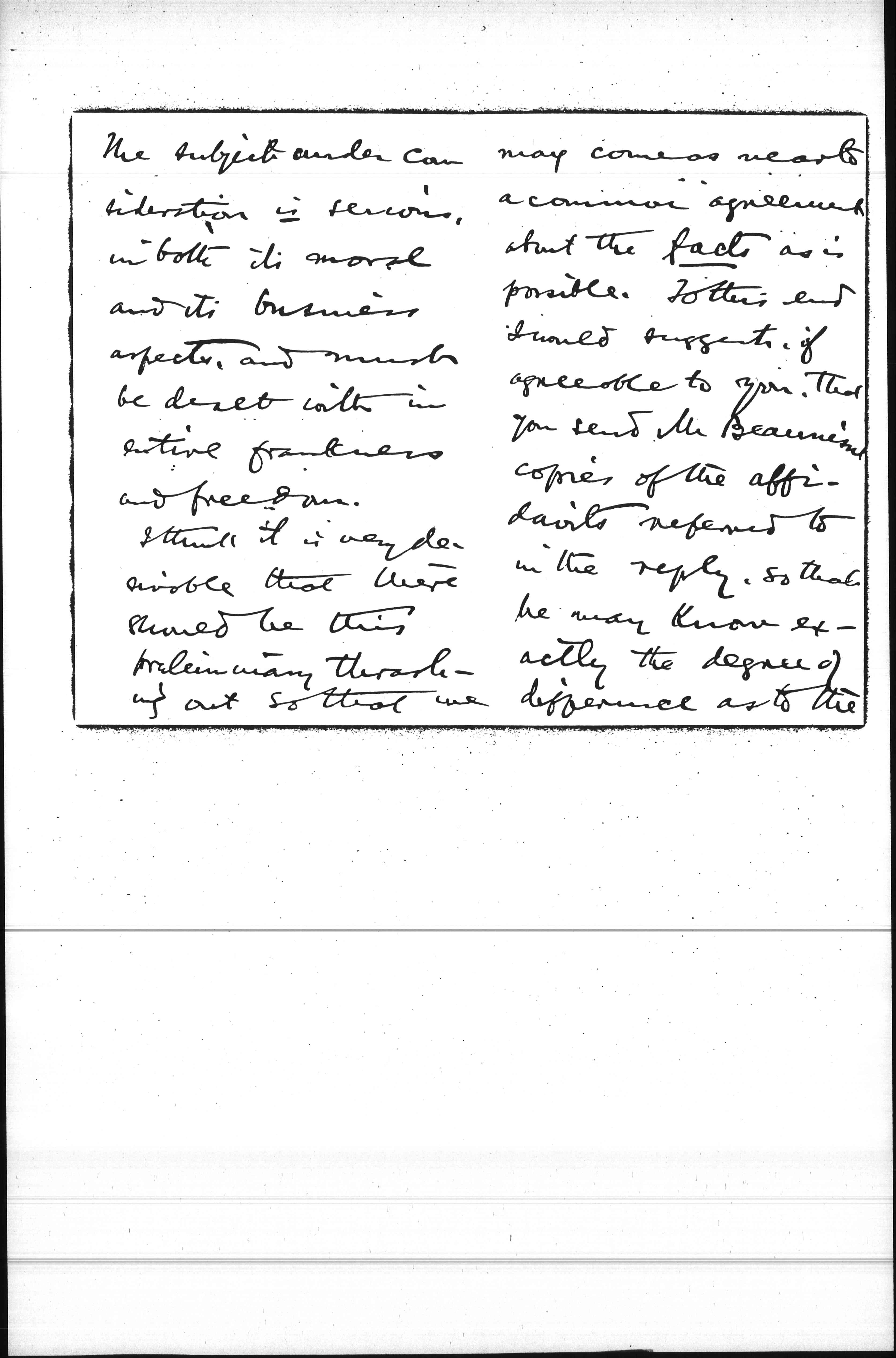 I think it is very desirable that there should be this preliminary thrashing out so that we [page 3] may come as near to a common agreement about the facts as is possible. To this end I would suggest, it agreeable to you, that you send Mr Beaunisne copies of the affadavits referred to in the reply, so that he may know exactly the degree of difference as to the [page 4] facts in question that exists between his understanding of them and that of the investigators. If sent please address to Mr A. G. Beaunisne. I am advising him of this suggestion to you.