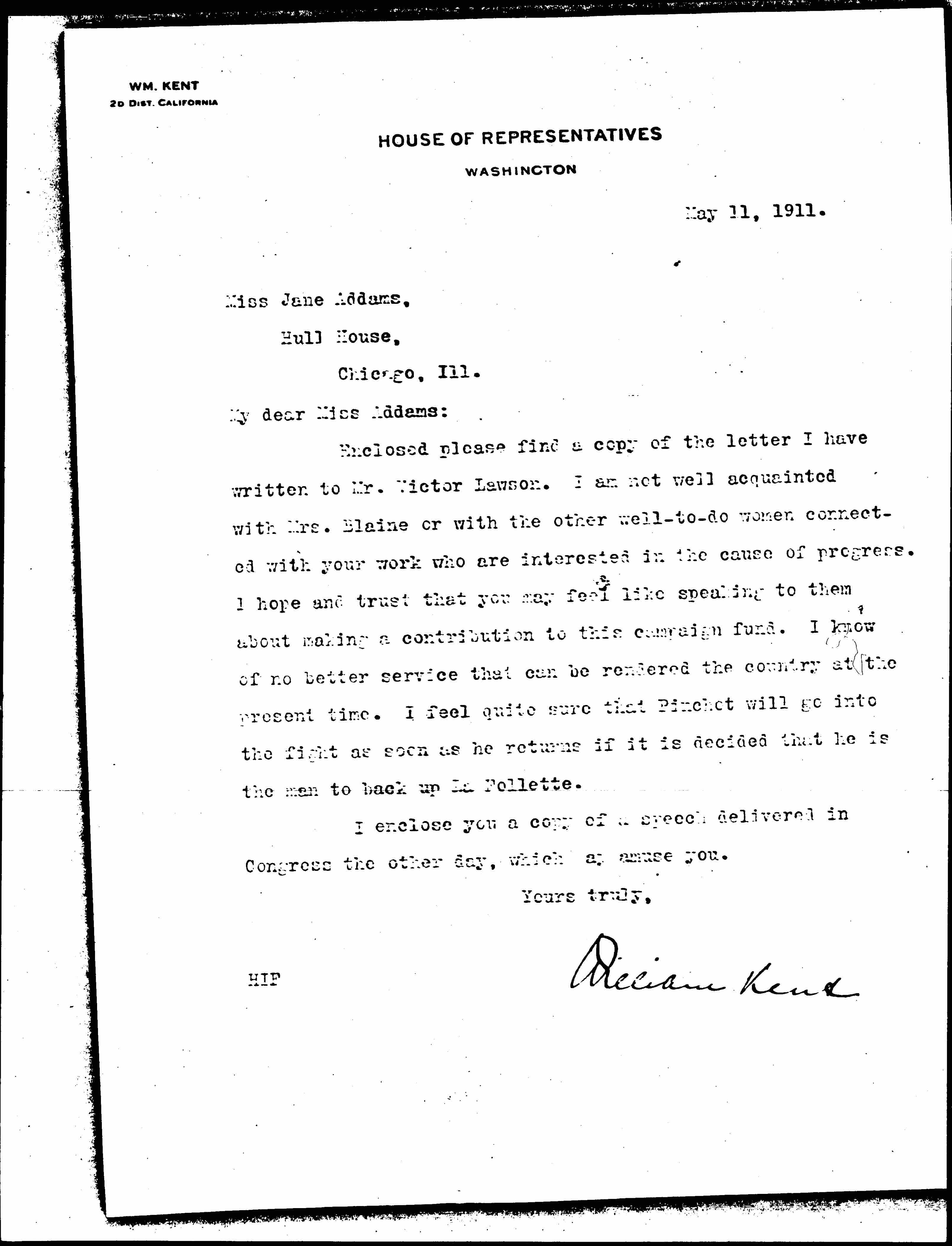 Enclosed please find a copy of the letter I have written to Mr. Victor Lawson. I am not well acquainted with Mrs. Blaine or with the other well-to-do women connected with your work who are interested in the cause of progress. I hope and trust that you may feel like speaking to them about making a contribution to the campaign fund. I know of no better service that can be rendered the country at the present time. I feel quite sure that Pinchet will go into the fight as soon as he returns if it is decided that he is the man to back up La Follette.