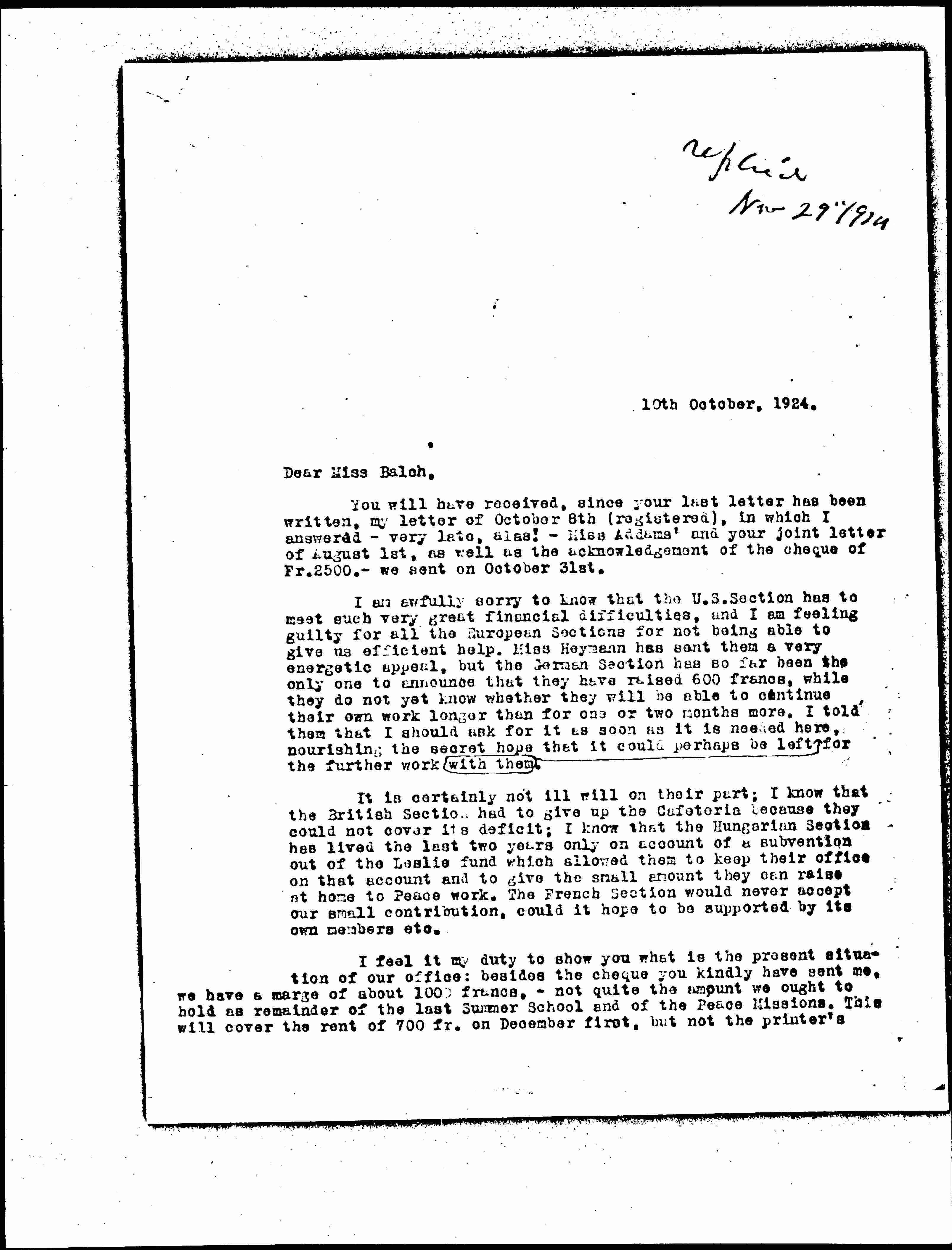 I feel it my duty to show you what is the present situation of our office: besides the [check] you kindly have sent me, we have a marge of about 1000 francs. -- not quite the amount we ought to hold as a remainder of the last Summer School and of the Peace Missions. This will cover the rent of 700 fr. on December first, but not the printer's [page 2] bill for Dr. Woker's article, of which I have ordered several thousands in each language. Should not some unexpected income arrive, I shall have to draw on the German contribution, which this year will no more be a quantité nègligeable.