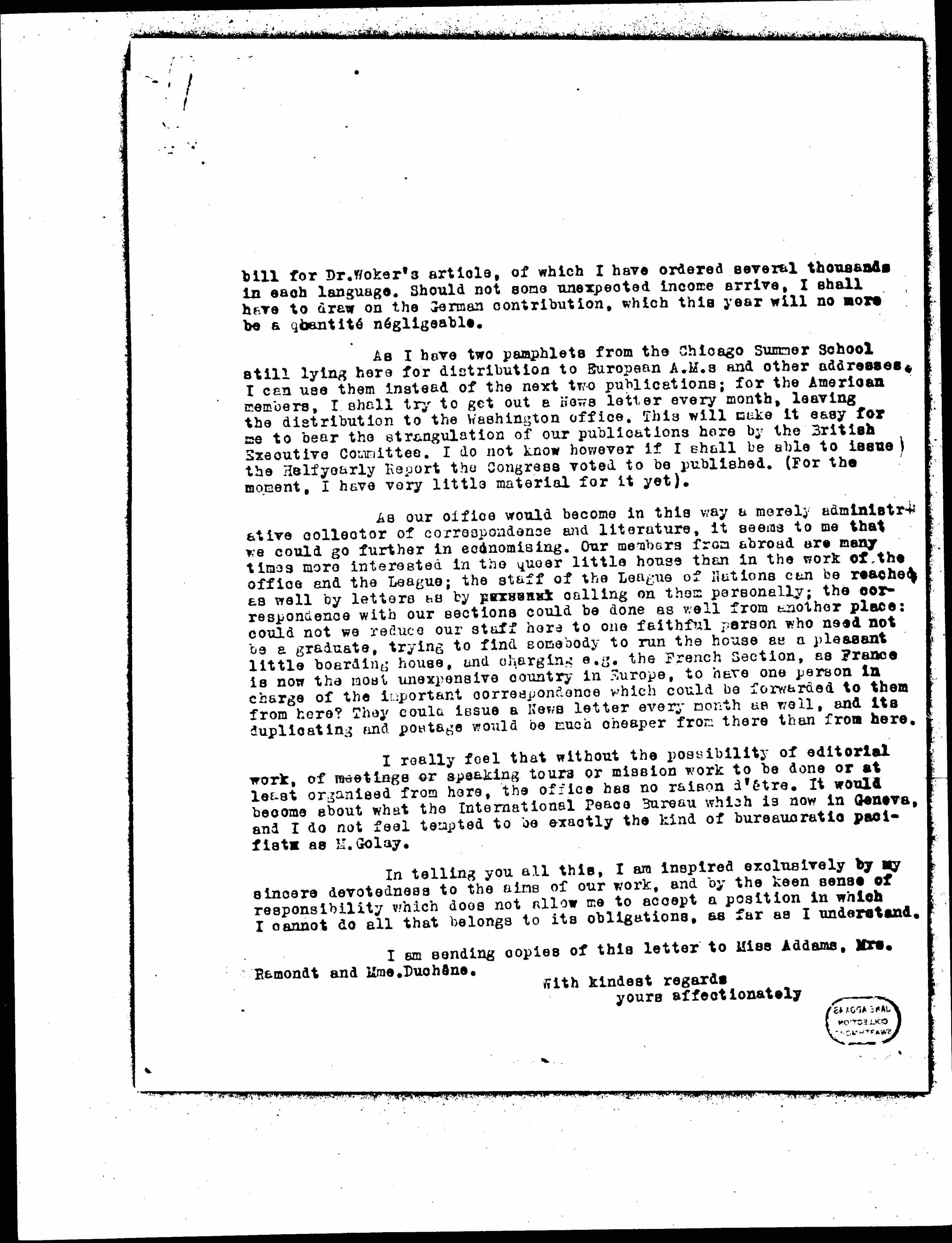 As our office would become in this way a merely administrative collector of correspondence and literature, it seems to me that we could go further in [economizing]. Our members from abroad are many times more interested in the queer little house than in the work of the office and the League; the staff of the League of Nations can be reached as well by letters as by personal calling on them personally; the correspondence with out sections could be done as well from another place: could not we reduce our staff here to one faithfull person who need not be a graduate, trying to find somebody to run the house as a pleasant little boarding house, and charging e.g. the French Section, as France is now the most [inexpensive] country in Europe, to have one person in charge of the important correspondence which could be forwarded to them from here? They could issue a News letter every month as well, and its duplicating and postage would be much cheaper from there than from here.