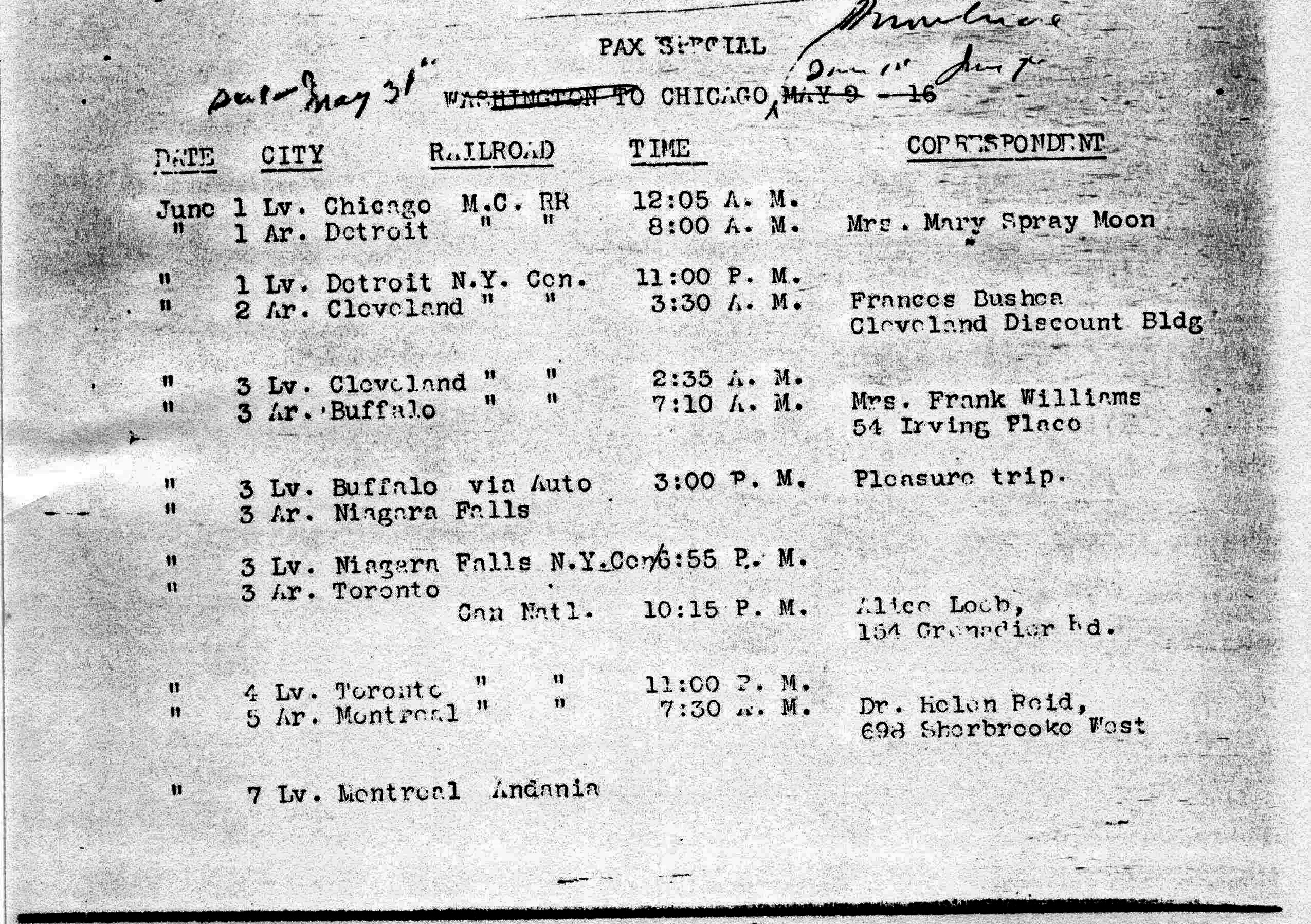 ↓Sat May 31"↑ WASHINGTON TO CHICAGO ↓to Montreal Sun 1st June [illegible]↑ MAY 9-16