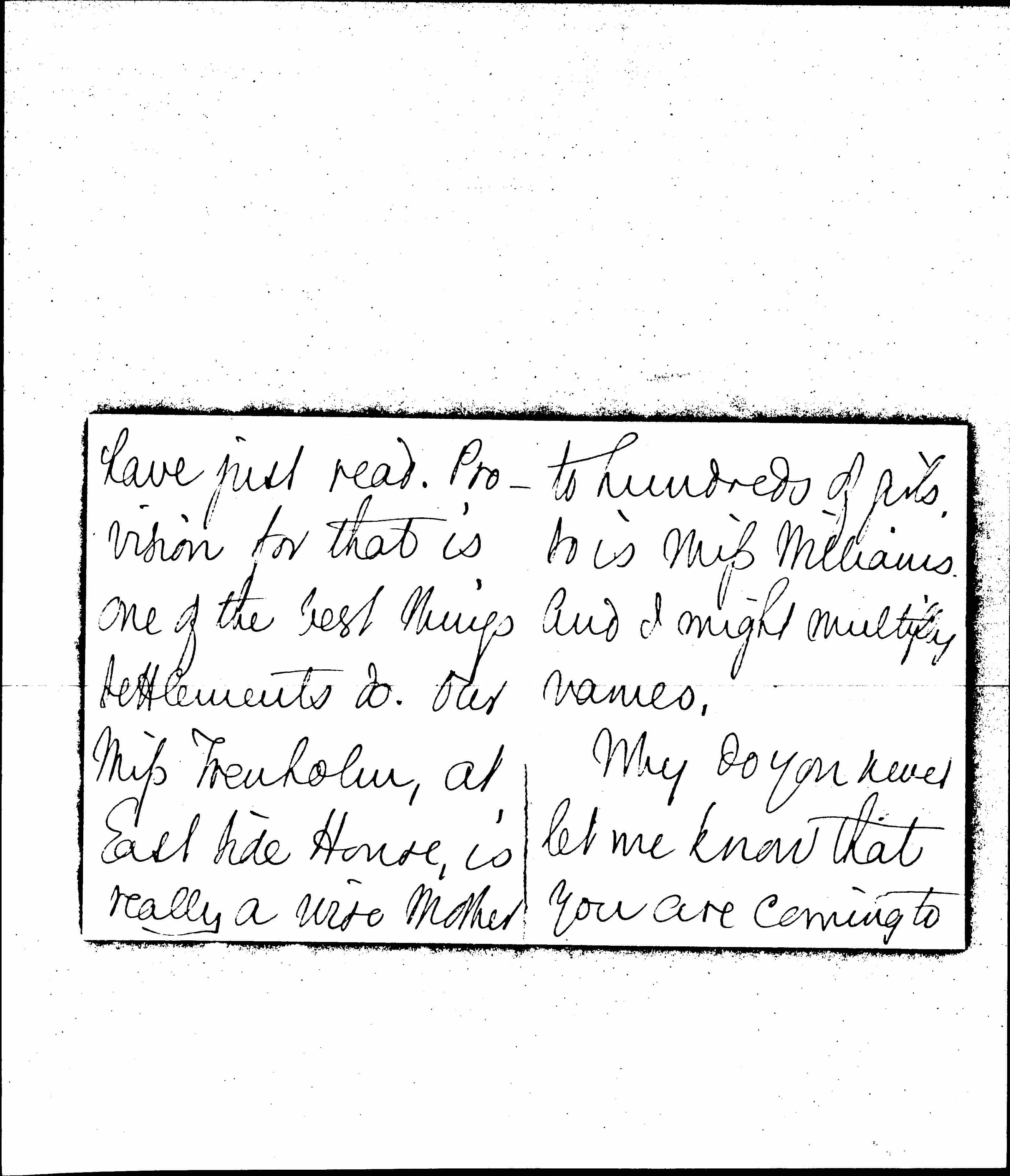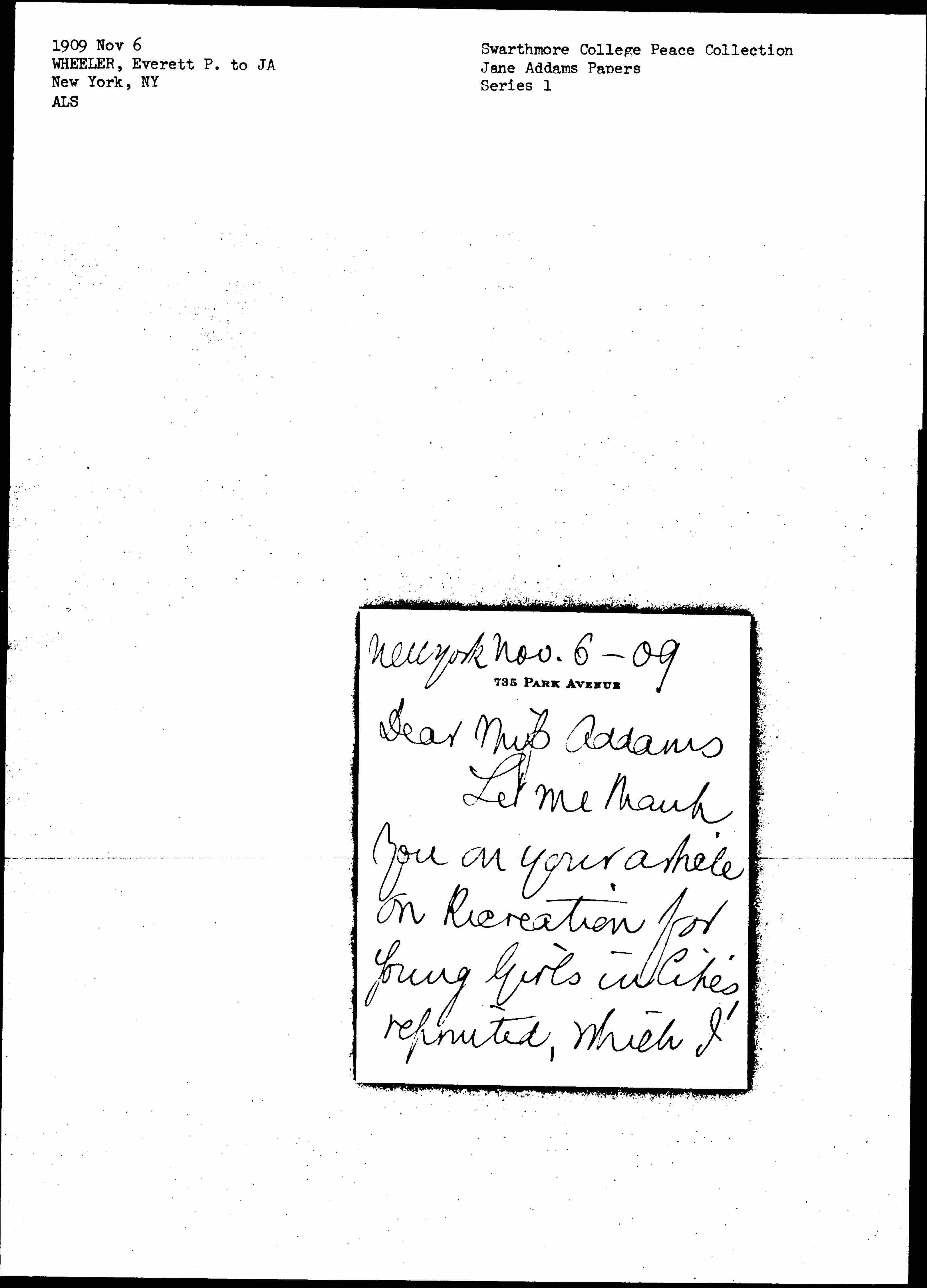 Let me thank you on your article on Recreation for Young Girls in Cities, reprinted, which I [page 2] have just read. Provision for that is one of the best things Settlements do. Our [Miss] Trenholm, at East Side House, is really a wise Mother [page 3] to hundreds of girls. So is [Miss] Williams and I might multiply names.