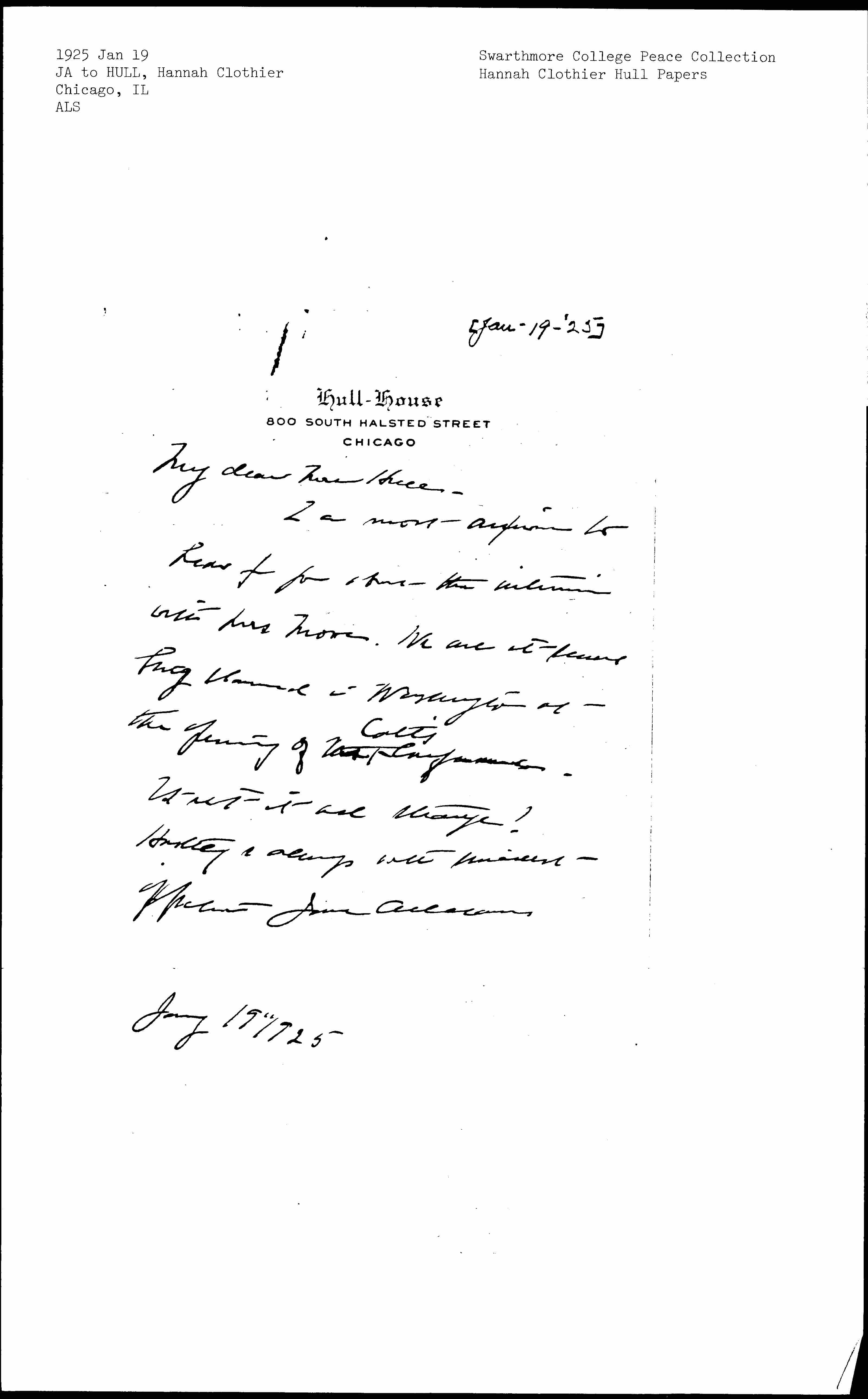 Hastily & always with sincere affection Jane Addams