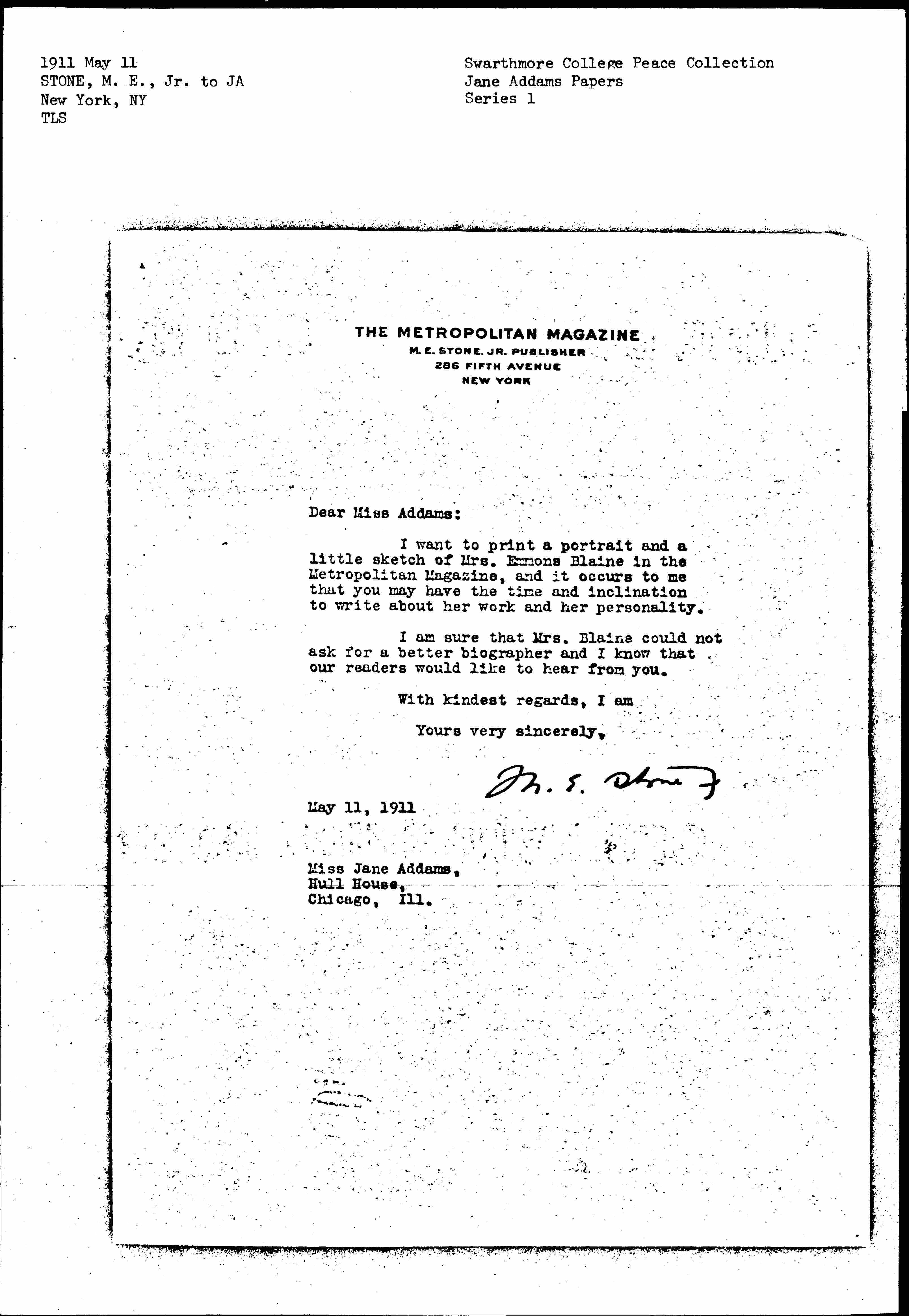 I want to print a portrait and a little sketch of Mrs. Emmons Blaine in the Metropolitan Magazine, and it occurs to me that you may have the time and inclination to write about her work and her personality.