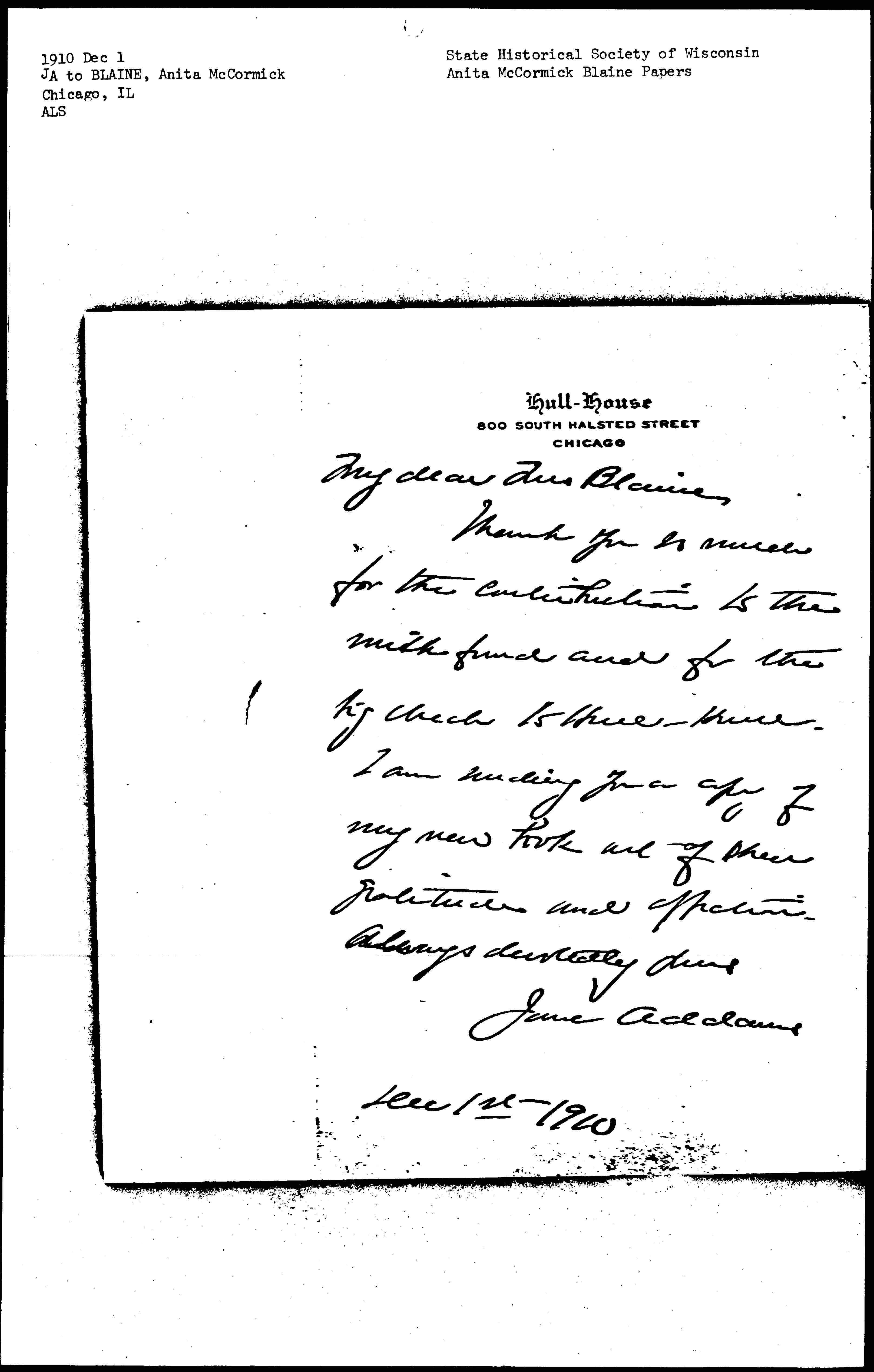Thank you so much for the contibution to the milk fund and for the big check to Hull-House. I am sending you a copy of my new book out of sheer gratitude and affection.