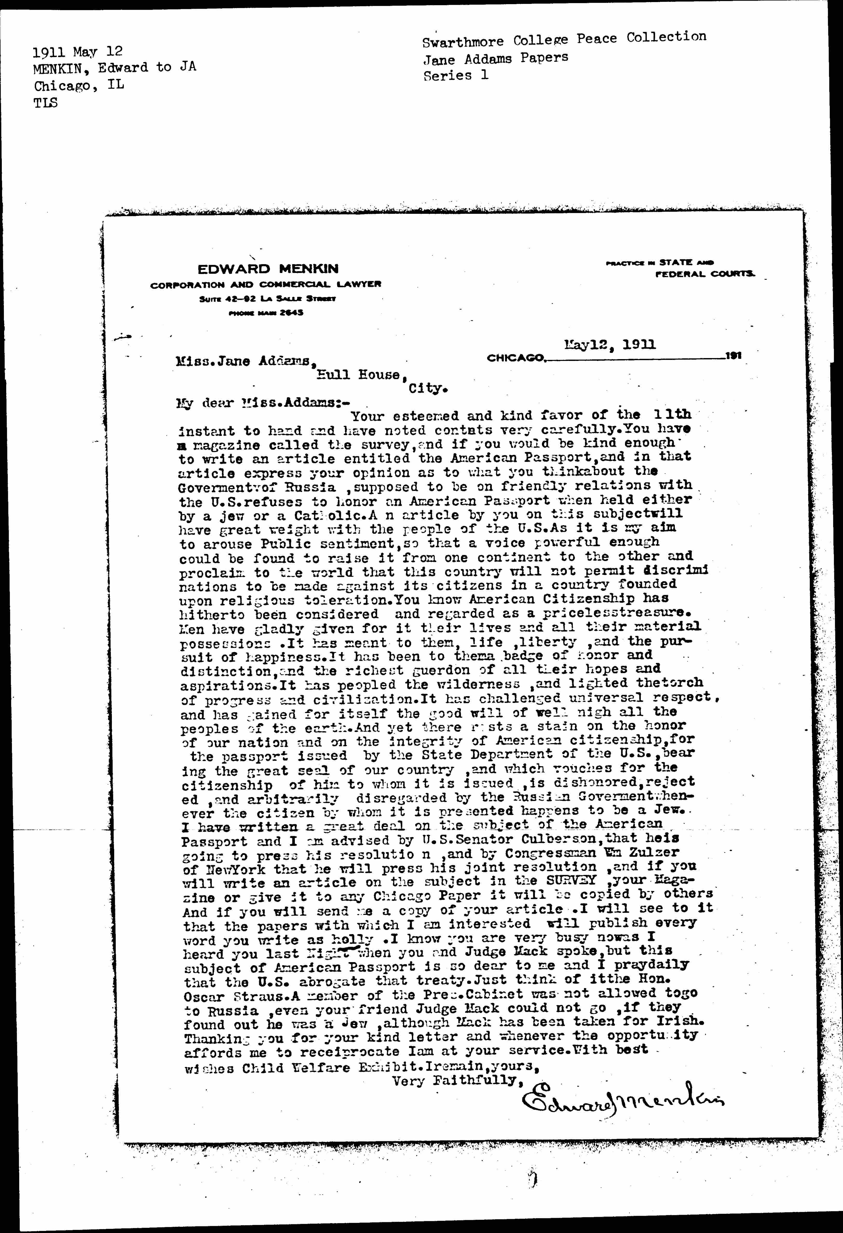 Your esteemed and kind favor of the 11th instant to hand and have noted [contacts] very carefully. You have a magazine called the survey, and if you would be kind enough to write an article entitled the American Passport, and in that article express your opinion as to what you think about the Government of Russia, supposed to be on friendly relations with the U.S. refuses to honor and American Passport when held either by a Jew or a Catholic. An article by you on this subject will have great weight with the people of the U.S. As it is my aim to arouse Public sentiment, so that a voice powerful enough could be found to raise it from one continent to the other and proclaim to the world that this country will not permit discriminations to be made against its citizens in a country founded upon religious toleration. You know American Citizenship has hitherto been considered and regarded as a priceless treasure. Men have gladly given for it their lives and all their material possessions. It has meant to them, life, liberty, and the pursuit of happiness. It has been to them a badge of honor and distinction, and the richest guerdon of all their hopes and aspirations. It has peopled the wilderness, and lighted the torch of progress and civilization. It has challenged universal respect, and has gained for itself the good will of well-nigh all the peoples of the earth. And yet there rests a stain on the honor of our nation and on the integrity of American citizenship, for the passport issued by the State Department of the U.S., bearing the great seal of our country, and which vouches for the citizenship of him to whom it is issued, is dishonored, rejected, and arbitrarily disregarded by the Russian Government whenever the citizen by whom it is presented happens to be a Jew. I have written a great deal on the subject of the American Passport and I am advised by U.S. Senator Culberson, that he is going to press his resolution, and by Congressman W. [Sulzer] of New York that he will press his joint resolution, and if you will write an article on the subject in the SURVEY, your Magazine or give it to any Chicago Paper it will be copied by others. And if you will send me a copy of your article. I will see to it that the papers with which I am interested will publish every word you write as holly. I know you are very busy now as I heard you last Night when you and Judge Mack spoke, but this subject of American Passport is so dear to me and I pray daily that the U.S. abrogate that treaty. Just think of it the Hon. Oscar Straus. A member of the Pres. Cabinet was not allowed to go to Russia, even your friend Judge Mack could not go, if they found out he was a Jew, although Mack has been taken for the Irish. Thanking you for your kind letter and whenever the opportunity affords me to [reciprocate] I am at your service. With best wishes Child Welfare Exhibit. I remain, yours,