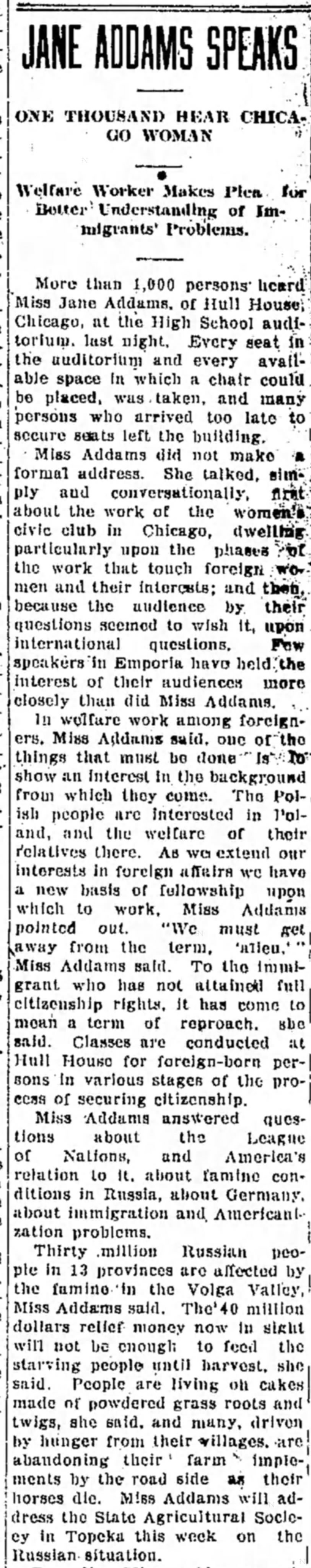 Miss Addams did not make a formal address. She talked, simply and conversationally, first about the work of the women's civic club in Chicago, dwelling particularly upon the phases of the work that touch foreign women and their interests; and then, because the audience by their questions seemed to wish it, upon international questions. Few speakers in Emporia have held the interest of their audiences more closely than did Miss Addams.