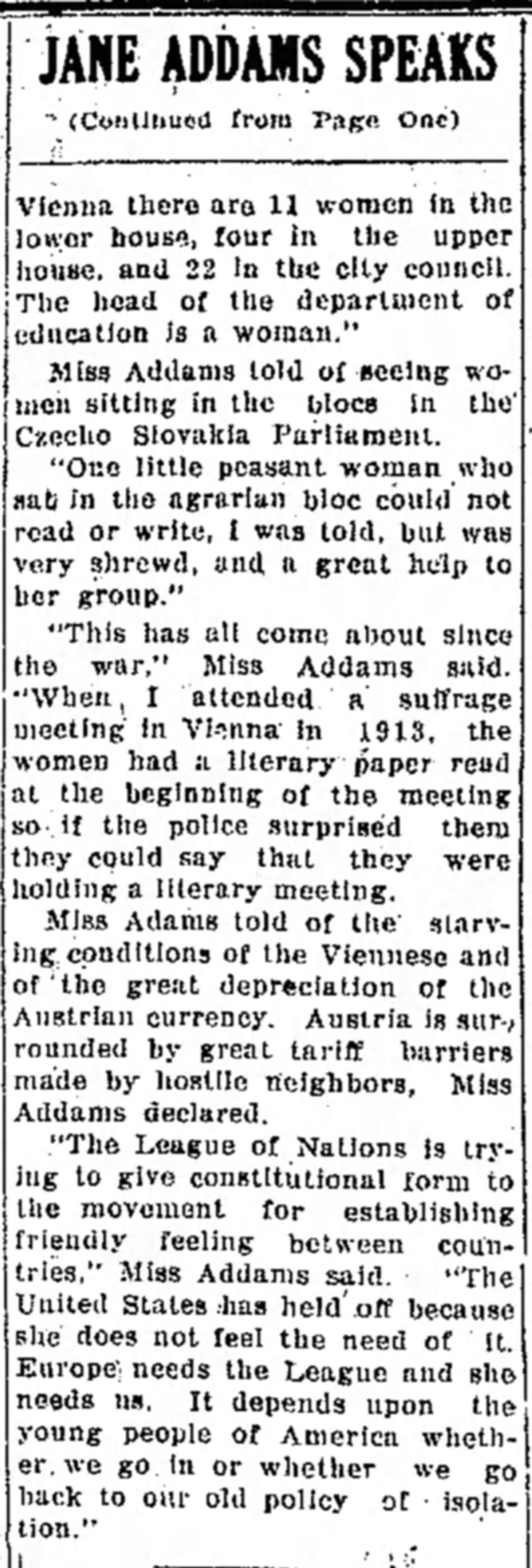 "The League of Nations is trying to give constitutional form to the movement for establishing friendly feeling between countries," Miss Addams said. "The United States has held off because she does not feel the need of it. Europe needs the League and she needs us. It depends upon the young people of America whether we go in or whether we go back to our old policy of isolation."