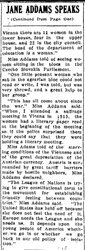"This has all come about since the war," Miss Addams said. "When I attended a suffrage meeting in Vienna in 1913, the women had a literary paper read at the beginning of the meeting so if the police surprised them they could say that they were holding a literary meeting."