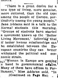 "There is a great desire for a new type of living, more genuine, more cultured, than the old type among the people of Europe, particularly among the young people," Jane Addams said in a talk to the Normal students this morning. "Groups of students have started a movement known as the 'Better Living Movement,' believing that if better human relationships can be established between the European countries they can better withstand the political and economic strain.