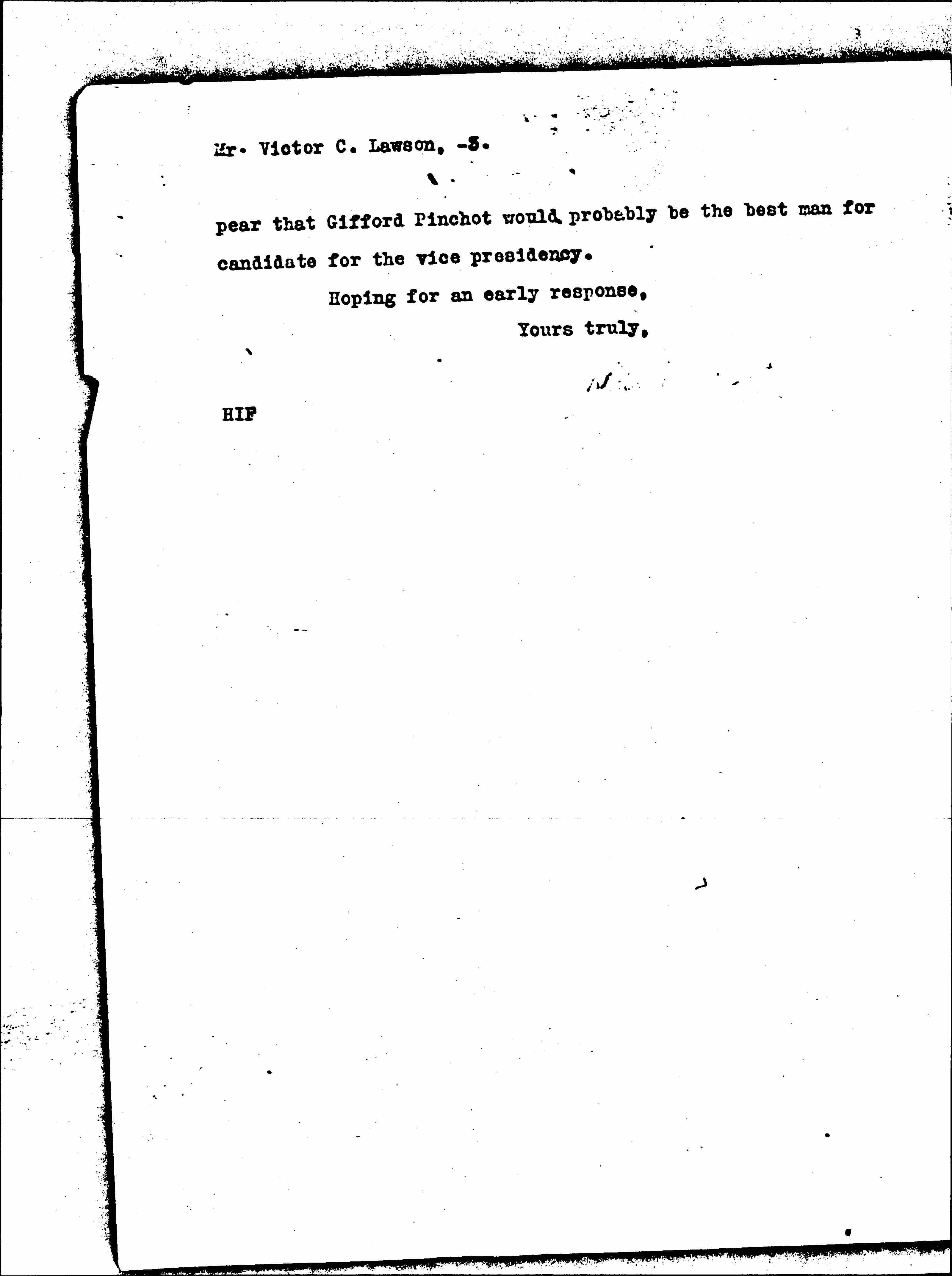 To come down to the practical question at issue at the present moment, we certainly need money and a good deal of it. I have subscribed myself for $10,000, which I feel is the best contribution I can make to my country at the present time. I would do more than this if my circumstances justified. I write to ask you if you will not do as much or more. I believe Crane and Rosenwald are partially committed to $25,000 apiece. We need $100,000 to start the movement. It would [page 3] appear that Gifford Pinchot would probably be the best man for candidate for the vice presidency.
