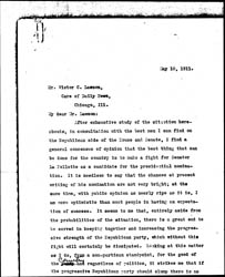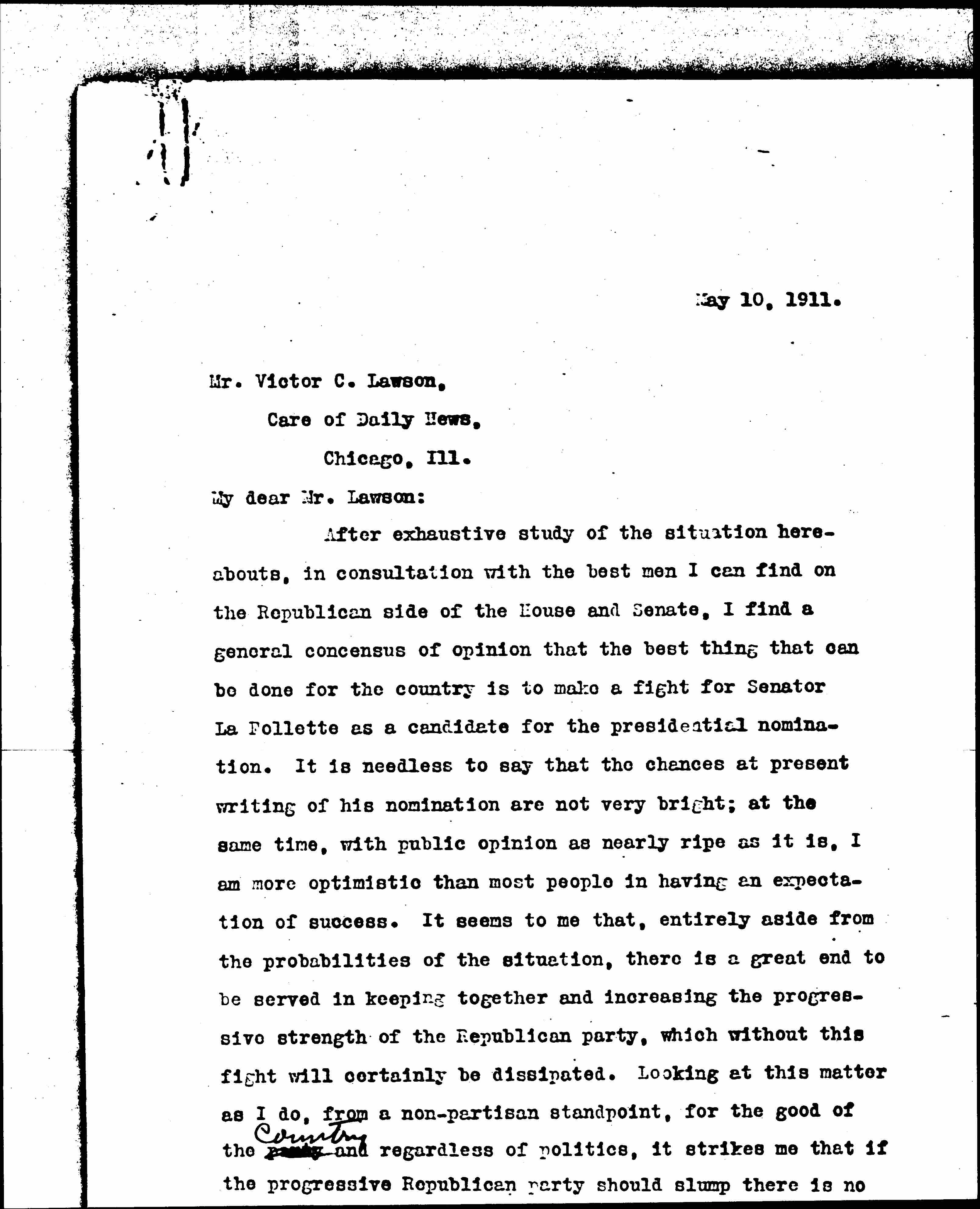 After exhaustive study of the situation hereabouts, in consultation with the best men I can find on the Republican side of the House and Senate, I find a general consensus of opinion that the best thing that can be done for the country is to make a fight for Senator La Follette as a candidate for the presidential nomination. It is needless to say that the chances at present writing of his nomination are not very bright; at the same time, with public opinion as nearly ripe as it is, I am more optimistic than most people in having an expectation of success. It seems to me that, entirely aside from the probabilities of the situation, there is a great end to be served in keeping together and increasing the progressive strength of the Republican party, which without this fight will certainly be dissipated. Looking at this matter as I do, from a non-partisan standpoint, for the good of the party <country> and regardless of politics, it strikes me that if the progressive Republican party should slump there is no [page 2] assurance whatever but that the Democratic party would also fall into the hands of the interests, and we are not yet ripe for another third party.