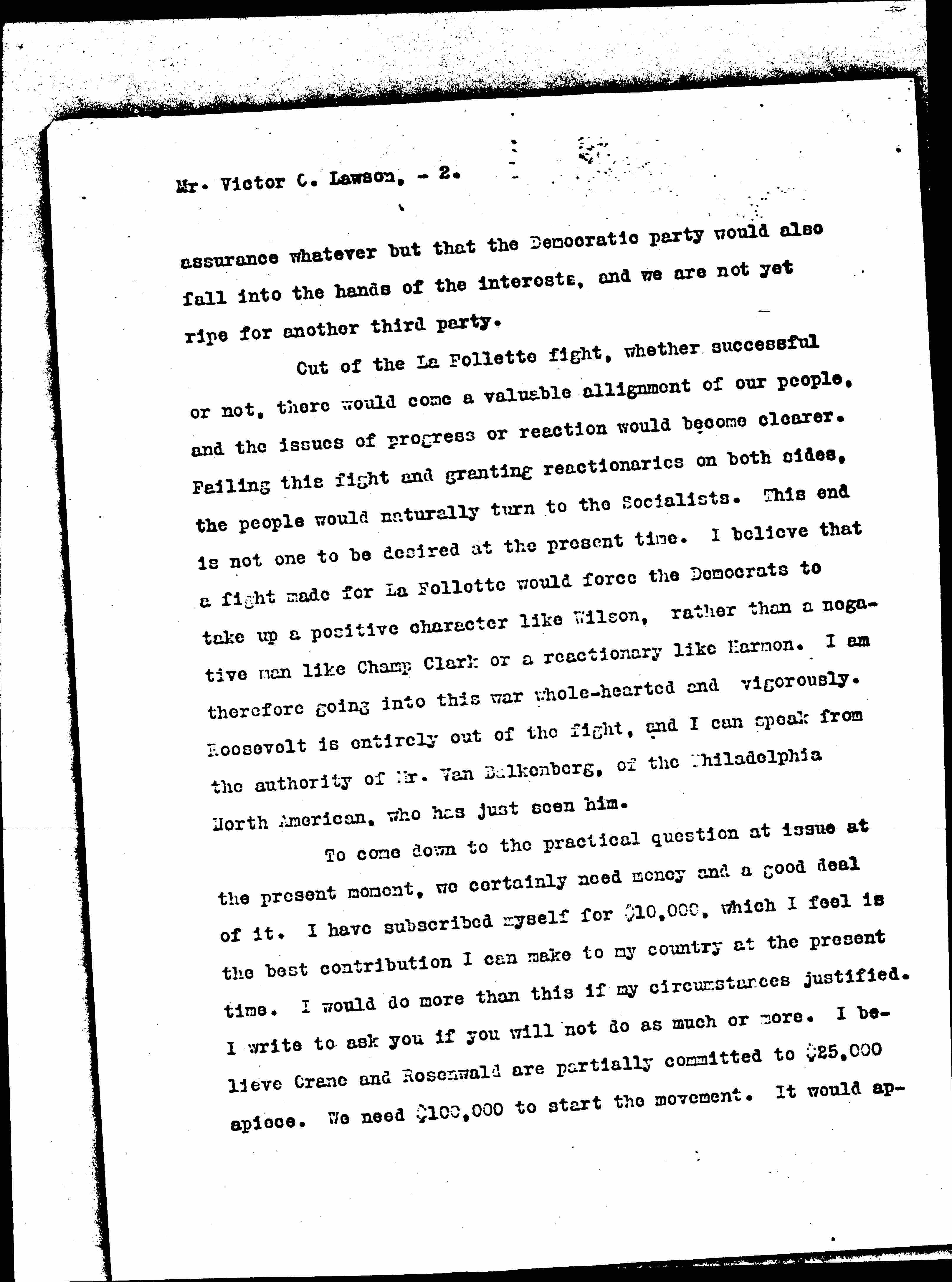 Cut of the La Follette fight, whether successful or not, there would come a valuable alignment of our people, and the issues of progress or reaction would become clearer. Failing this fight and granting reactionaries on both sides, the people would naturally turn to the Socialists. This end is not one to be desired at the present time. I believe that a fight made for La Follette would force the Democrats to take up a positive character like Wilson, rather than a negative man like Champ Clark or a reactionary like Harmon. I am therefore going into this war whole-hearted and vigorously. Roosevelt is entirely out of the fight, and I can speak from the authority of Mr. Van Balkenberg, of the Philadelphia North American, who has just seen him.