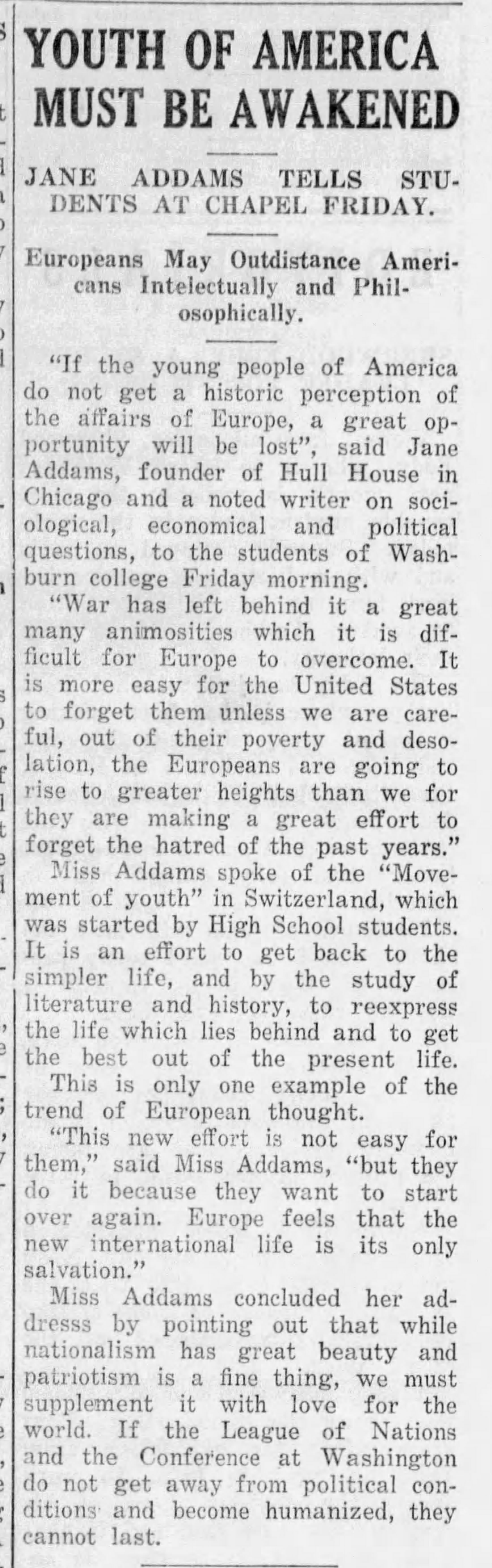 "If the young people of America do not get a historic perception of the affairs of Europe, a great opportunity will be lost," said Jane Addams, founder of Hull House in Chicago and a noted writer on sociological, economical and political questions, to the students of Washburn College Friday morning.