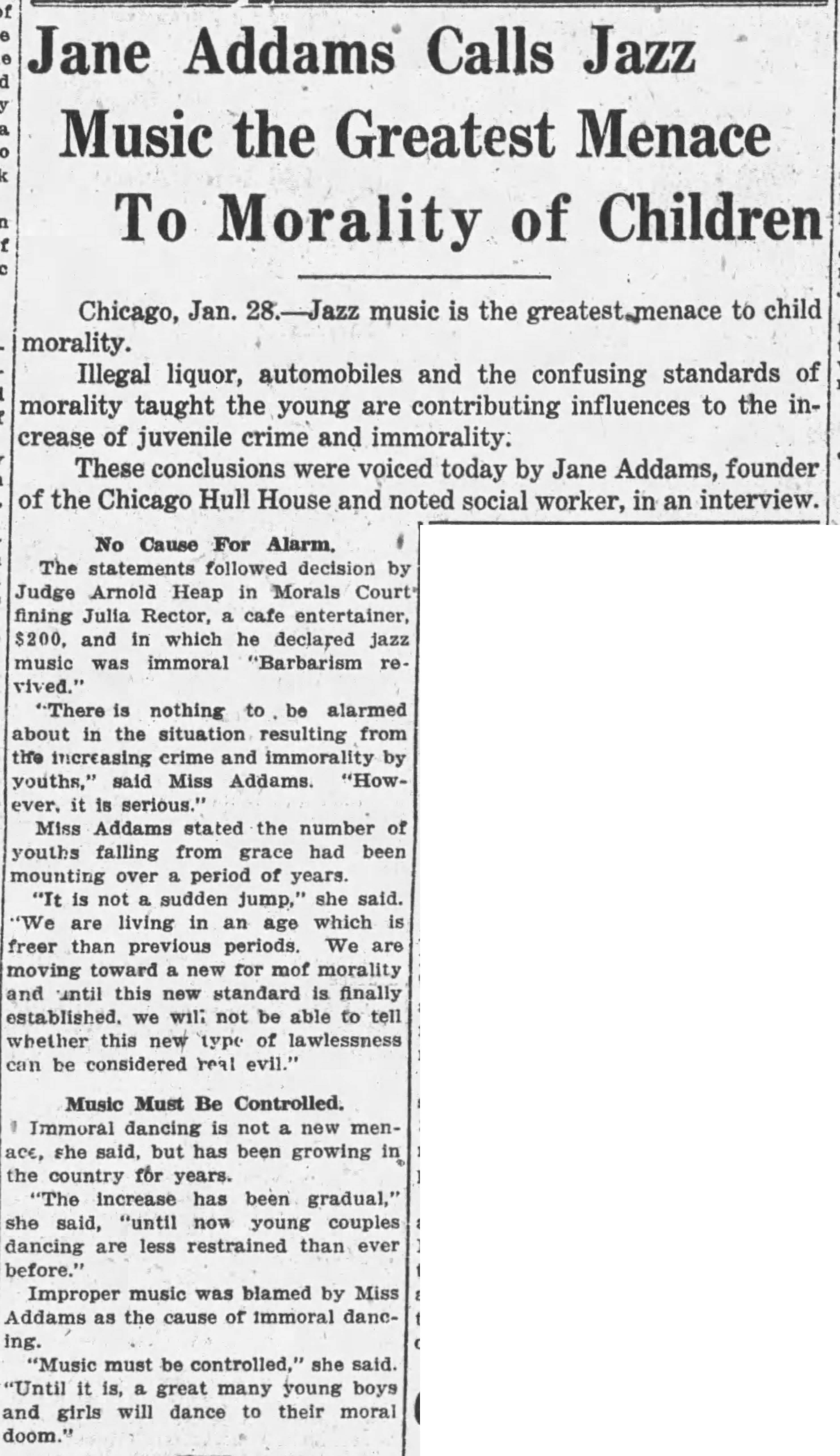 Jane Addams Calls Jazz Music the Greatest Menace to Morality of Children