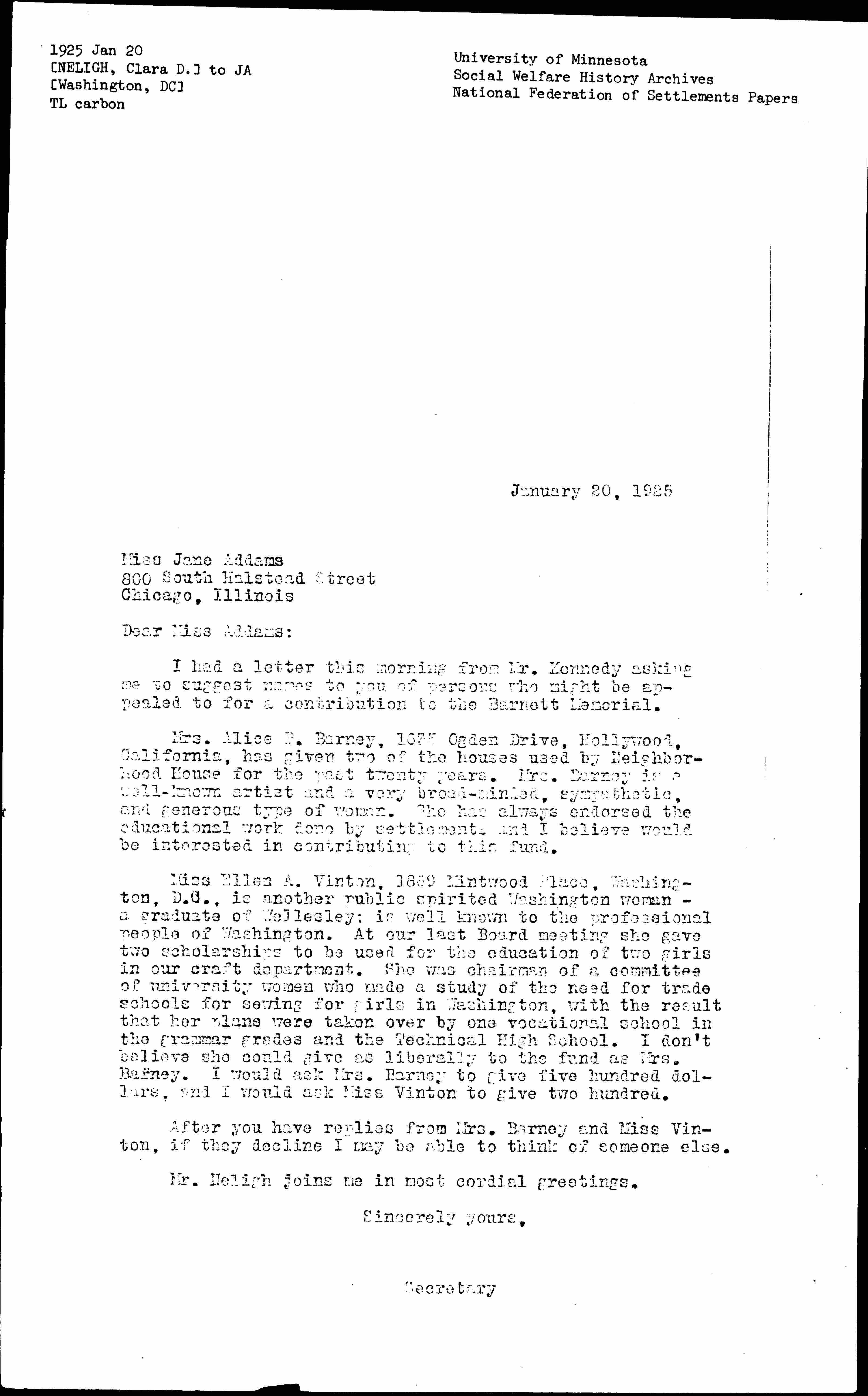 Miss Ellen A. Vinton, 1869 Mintwood Place, Washington, D.C., is another public spirited Washington woman -- a graduate of Wellesley; is well known to the professional people of Washington. At our last Board meeting she gave two scholarships to be used for the education of two girls in our craft department. She was chairman of a committee of university women who made a study of the need for trade schools for sewing for girls in Washington, with the result that her plans were taken over by one vocational school in the grammar grades and the Technical High School. I don't believe she could give as liberally to the fund as Mrs. Barney. I would ask Mrs. Barney to give five hundred dollars, and I would ask Miss Vinton to give two hundred.