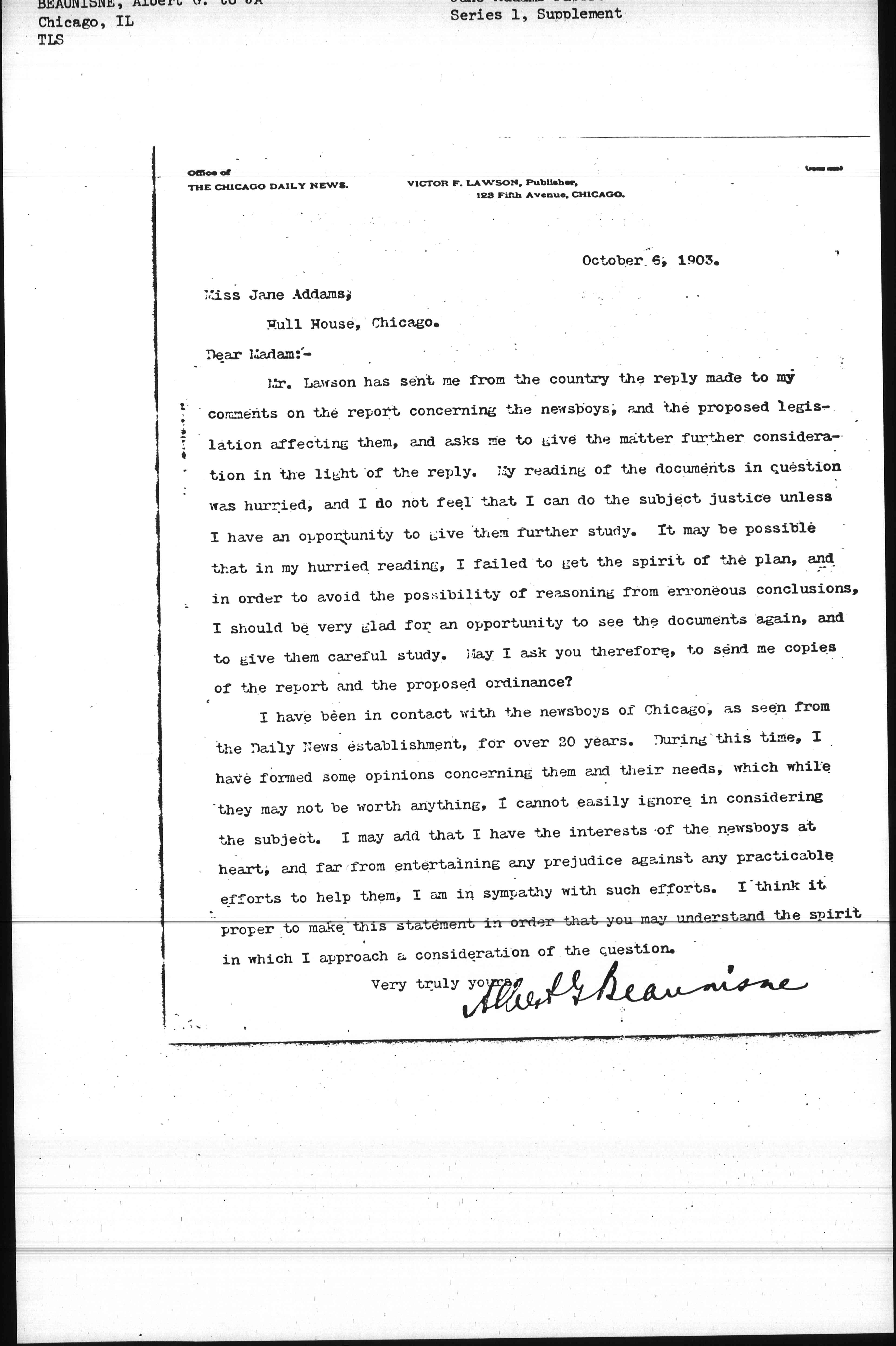 Mr. Lawson has sent me from the country the reply made to my comments on the report concerning the newsboys, and the proposed legislation affecting them, and asks me to give the matter further consideration in the light of the reply. My reading of the documents in question was hurried, and I do not feel that I can do the subject justice unless I have an opportunity to give them further study. It may be possible that in my hurried reading, I failed to get the spirit of the plan, and in order to avoid the possibility of reasoning from erroneous conclusions, I should be very glad for an opportunity to see the documents again, and to give them careful study. May I ask you therefore, to send me copies of the report and the proposed ordinance?