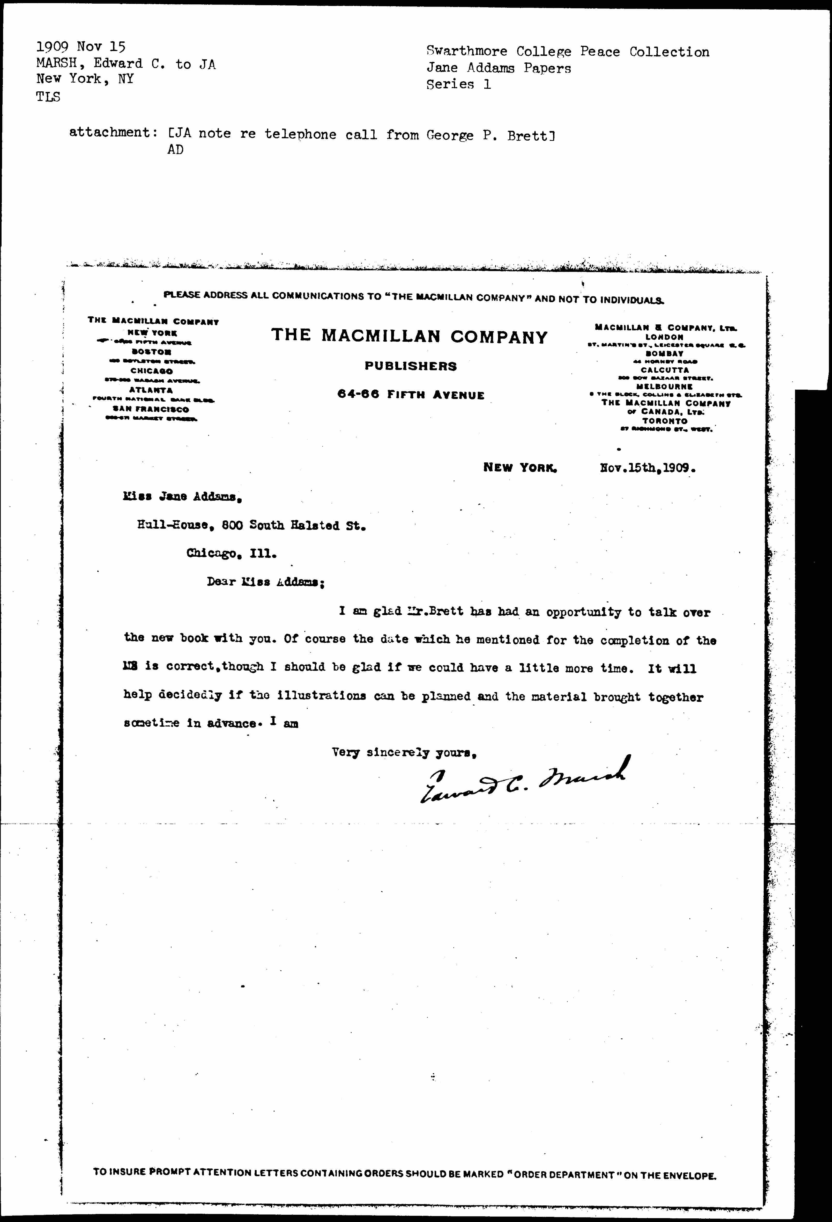 I am glad Mr. Brett has had an opportunity to talk over the new book with you. Of course the date which he mentioned for the completion of the manuscript is correct, though I should be glad if we could have a little more time. It will help decidedly if the illustrations can be planned and the material brought together sometime in advance. I am