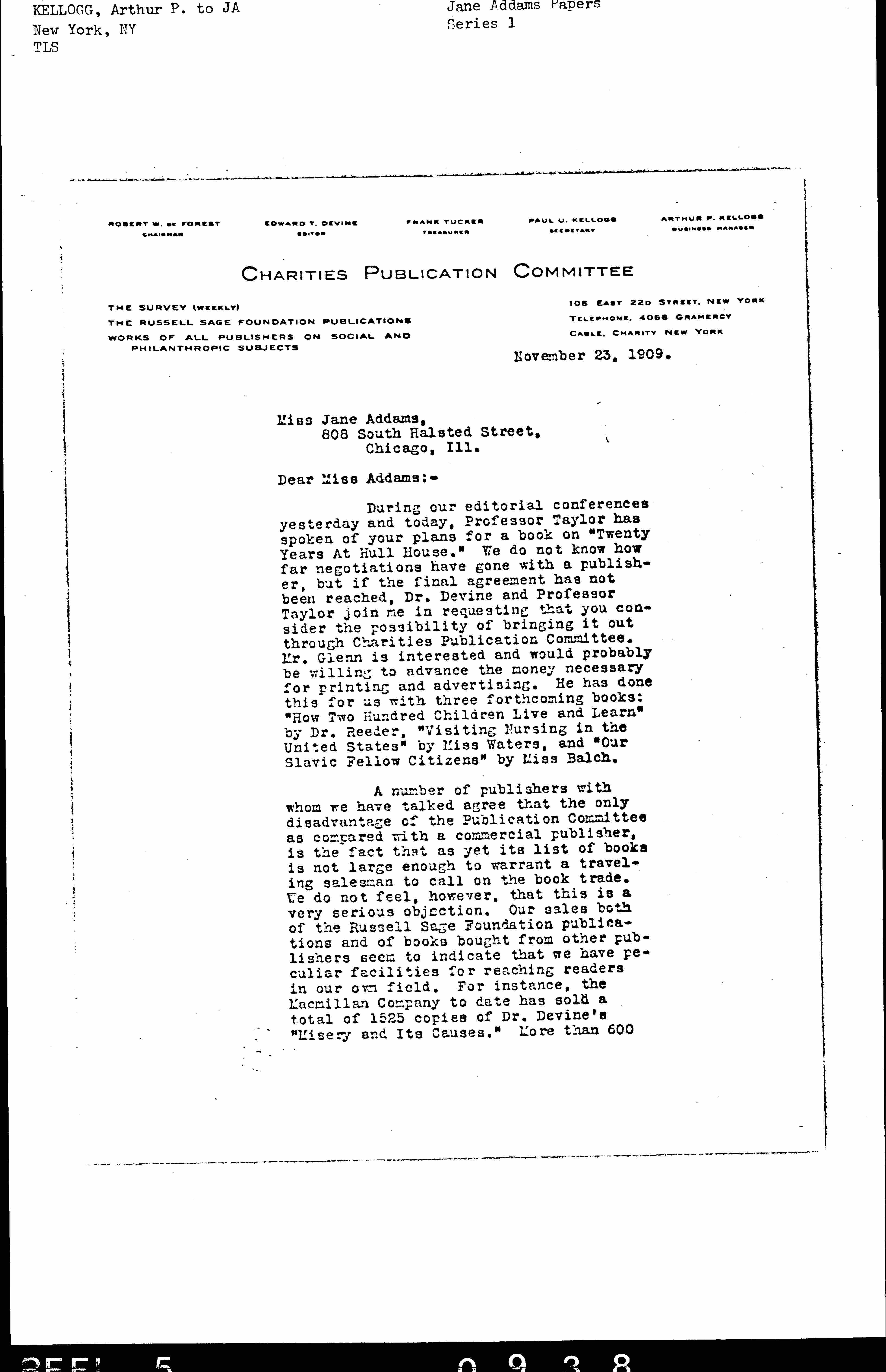 During our editorial conferences yesterday and today, Professor Taylor has spoken of your plans for a book on "Twenty Years At Hull House." We do not know how far negotiations have gone with a publisher, but if the final agreement has not been reached, Dr. Devine and Professor Taylor join me in requesting that you consider the possibility of bringing it out through Charities Publication Committee. Mr. Glenn is interested and would probably be willing to advance the money necessary for printing and advertising. He has done this for us with three forthcoming books: "How Two Hundred Children Live and Learn" by Dr. Reeder, "Visiting Nursing in the United States" by Miss Waters, and "Our Slavic Fellow Citizens" by Miss Balch.