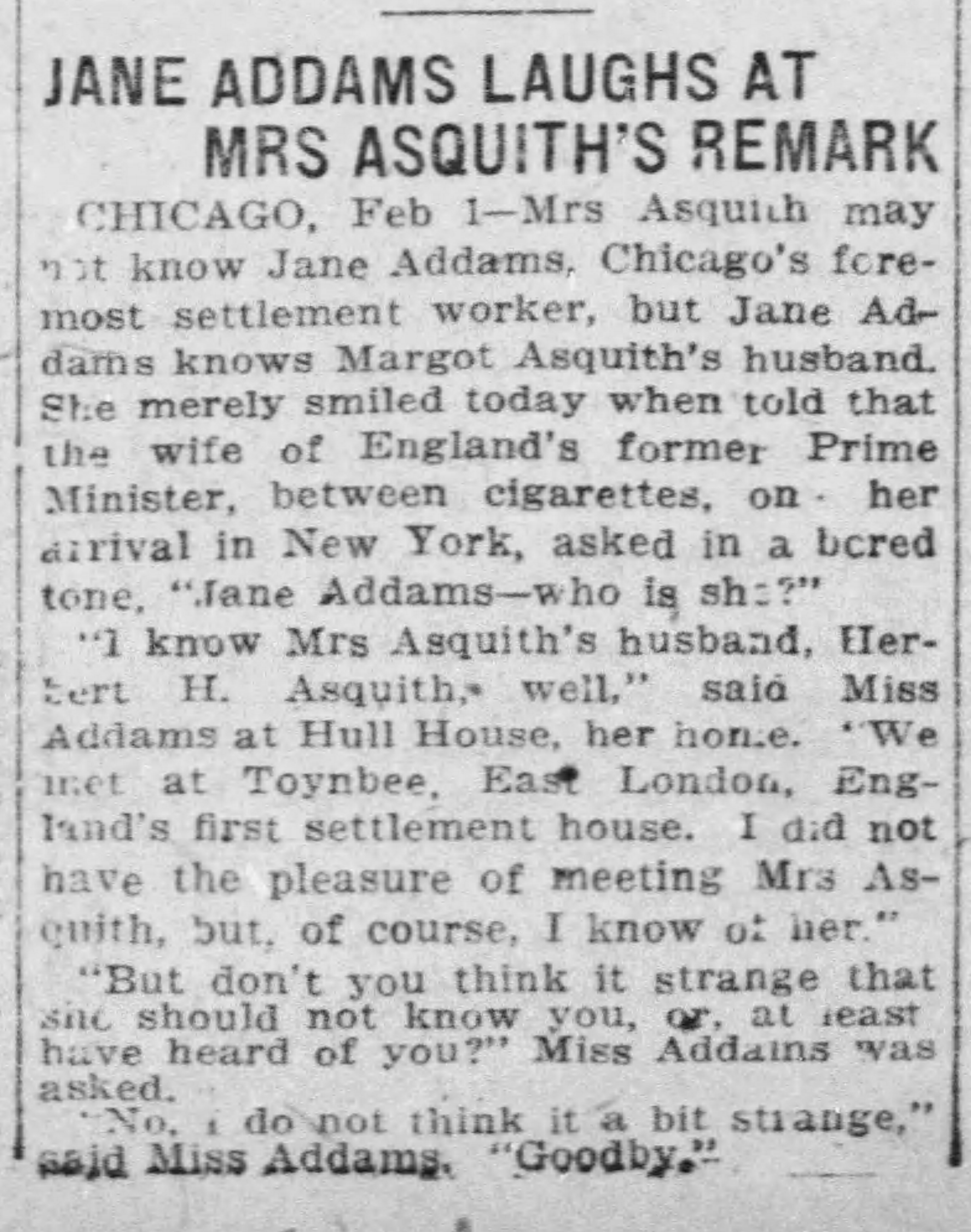 CHICAGO, Feb 1 -- Mrs Aquith may not know Jane Addams, Chicago's foremost settlement worker, but Jane Addams knows Margot Asquith's husband. She merely smiled today when told that the wife of England's former Prime Minister, between cigarettes, on her arrival in New York, asked in a bored tone, "Jane Addams -- who is she?"