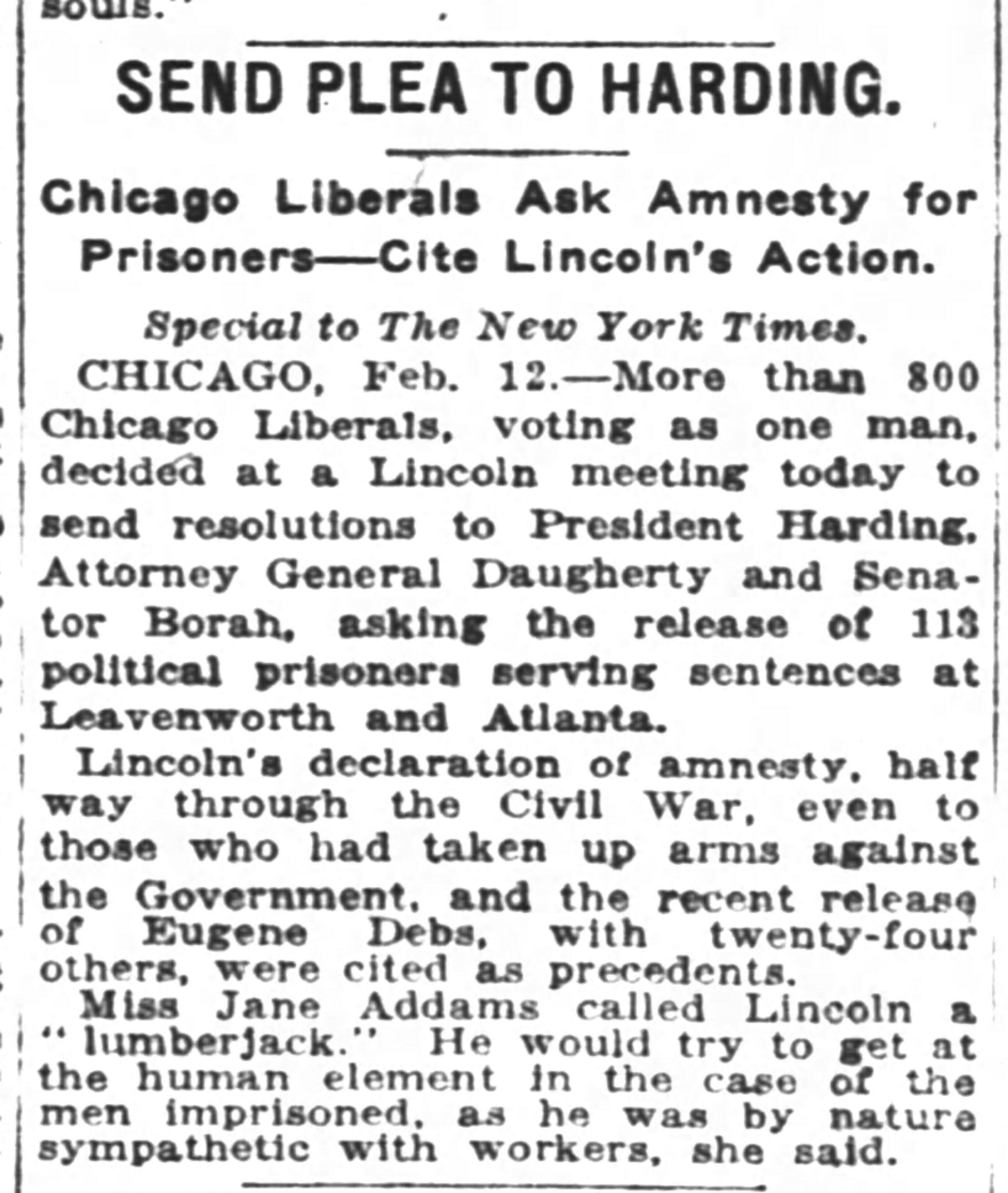 Chicago Liberals Ask Amnesty for Prisoners -- Cite Lincoln's Action.