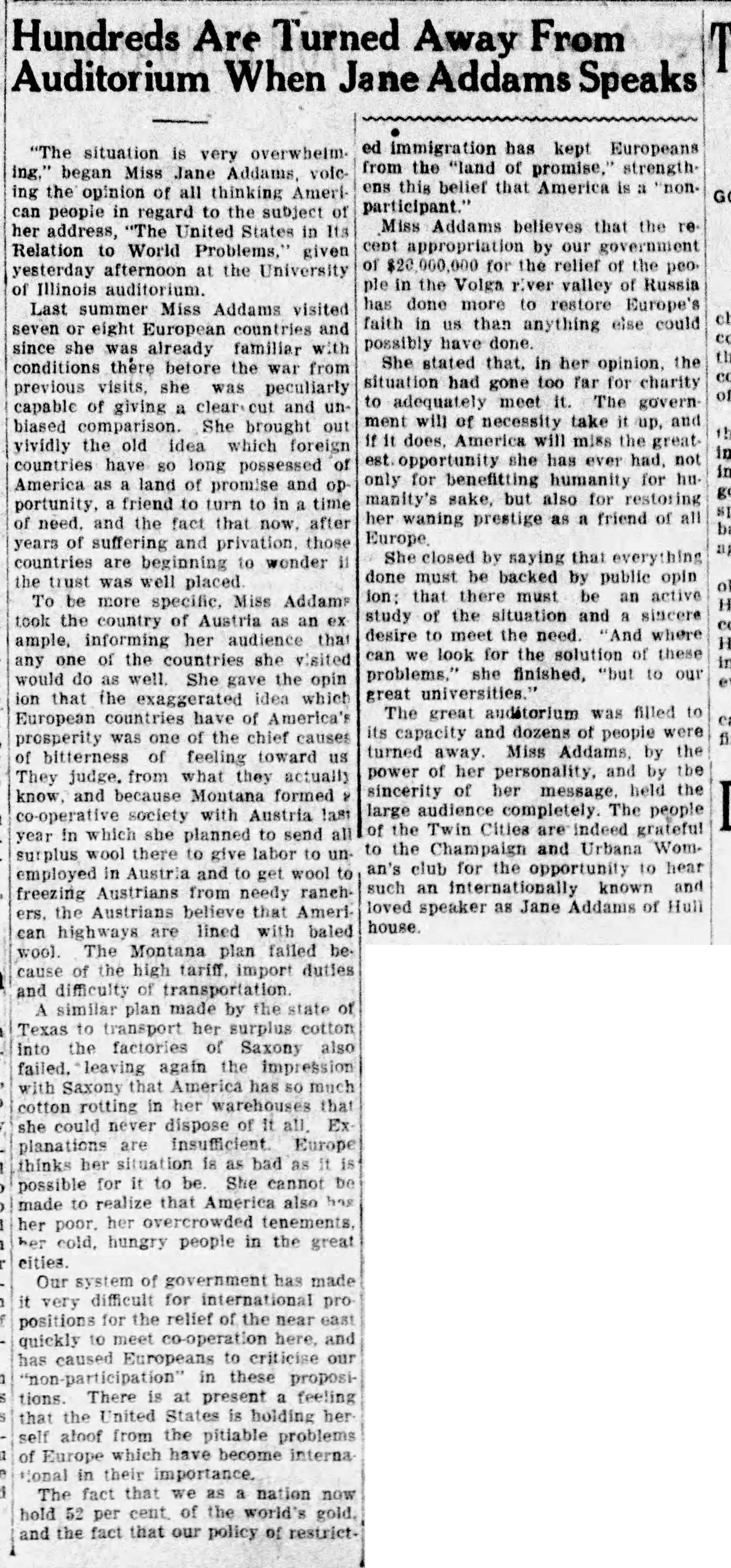 The great auditorium was filled to its capacity and dozens of people were turned away. Miss Addams, by the power of her personality, and by the sincerity of her message, held the large audience completely. The people of the Twin Cities are indeed grateful to the Champaign and Urbana Women's Club for the opportunity to hear such an internationally known and loved speaker as Jane Addams of Hull House.