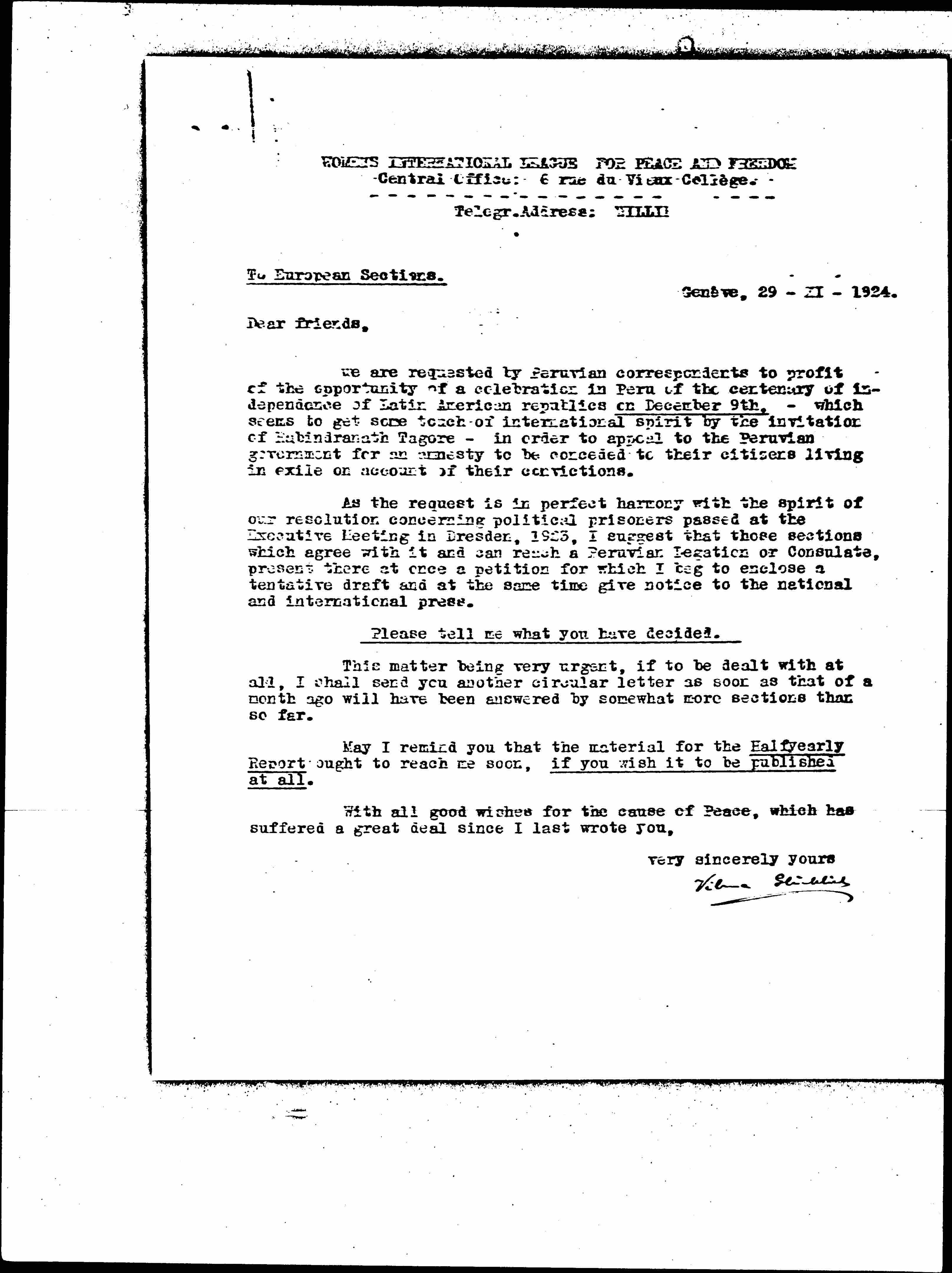 As the request is in perfect harmony with the spirit of our resolution concerning political prisoners passed at the Executive Meeting in Dresden, 1923, I suggest that those sections which agree with it and can reach a Peruvian Legation or Consulate, present there at once a petition for which I beg to enclose a tentative draft and at the same time give notice to the national and international press.